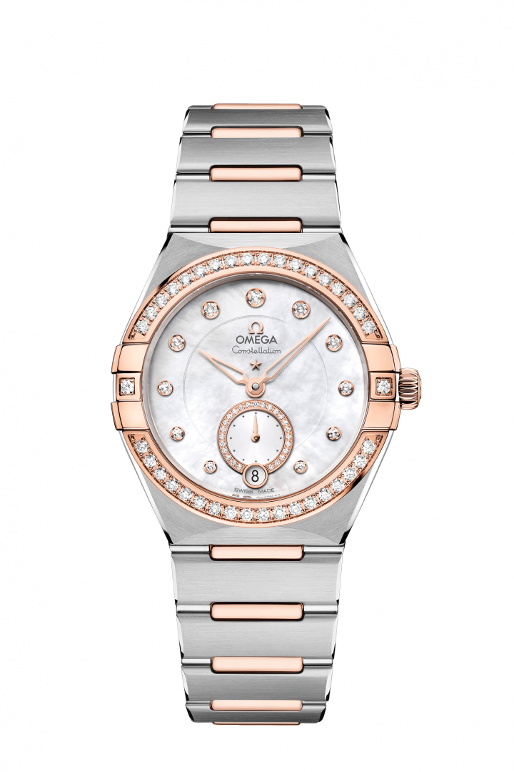 luxusné hodinky Omega Constellation Zlato & Diamanty, Automat, 34 mm. Hodinky disponujú funkciami ukazovateľ dátumu. Základné parametre hodín sú: typ strojčeka je mechanické hodinky s automatickým náťahom, materiál remienka je oceľ a zlato, vode odolnosť je 50 m a farba ciferníka je perleť.