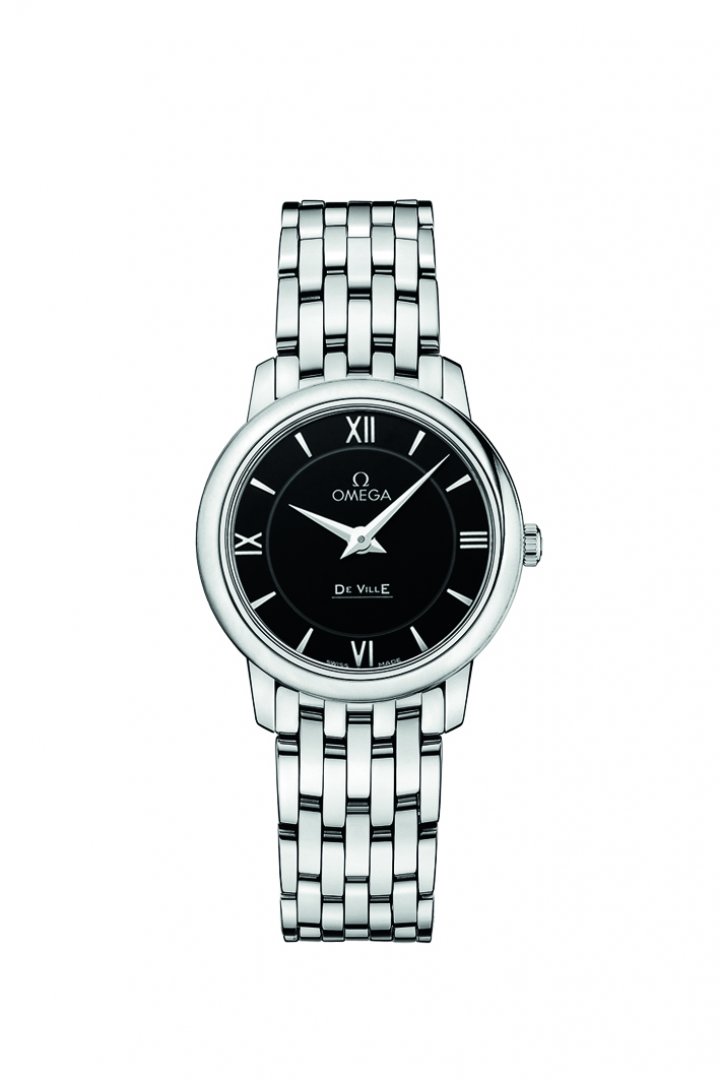 Luxusné hodinky Omega De Ville Prestige Rímske číslice, Quartz, 27.4 mm. Základné parametre hodín sú: farba ciferníka je čierna, typ strojčeka je Quartz hodinky, materiál remienka je oceľ a vode odolnosť je 30 m.