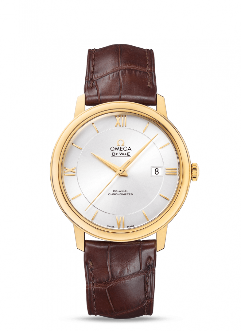 Luxusné hodinky Omega De Ville Prestige Zlato, Automat, 39.5 mm. Hodinky disponujú funkciami ukazovateľ dátumu. Základné parametre hodín sú: vode odolnosť je 30 m, typ strojčeka je mechanické hodinky s automatickým náťahom, materiál remienka je koža a farba ciferníka je strieborná.