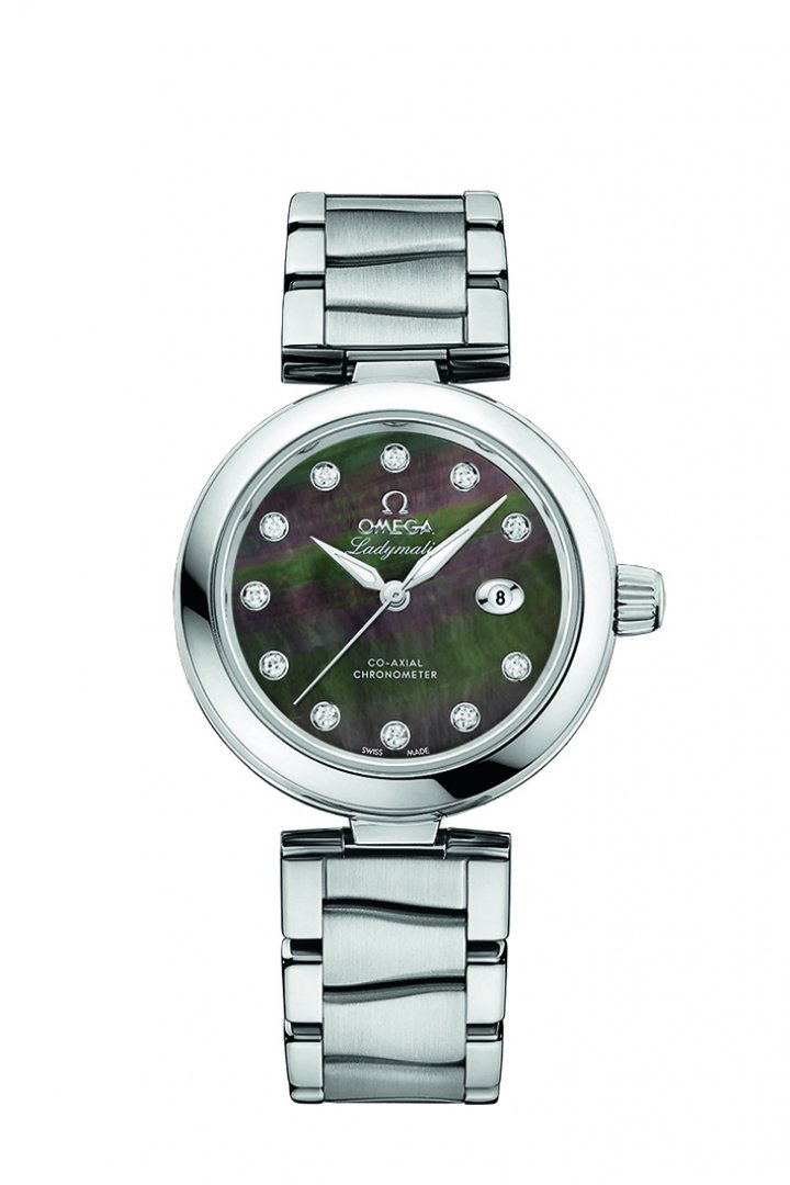 Luxusné hodinky Omega De Ville Ladymatic Diamanty, Automat, 34 mm. Hodinky disponujú funkciami luminiscencia a ukazovateľ dátumu. Základné parametre hodín sú: farba ciferníka je perleť a čierna, typ strojčeka je mechanické hodinky s automatickým náťahom, vode odolnosť je 100 m a materiál remienka je oceľ.