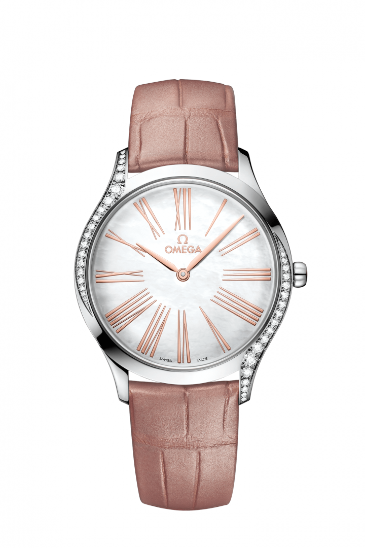 luxusné hodinky Omega De Ville Trésor Diamanty, Quartz, 36 mm. Základné parametre hodín sú: typ strojčeka je Quartz hodinky, materiál remienka je koža, vode odolnosť je 30 m a farba ciferníka je perleť.