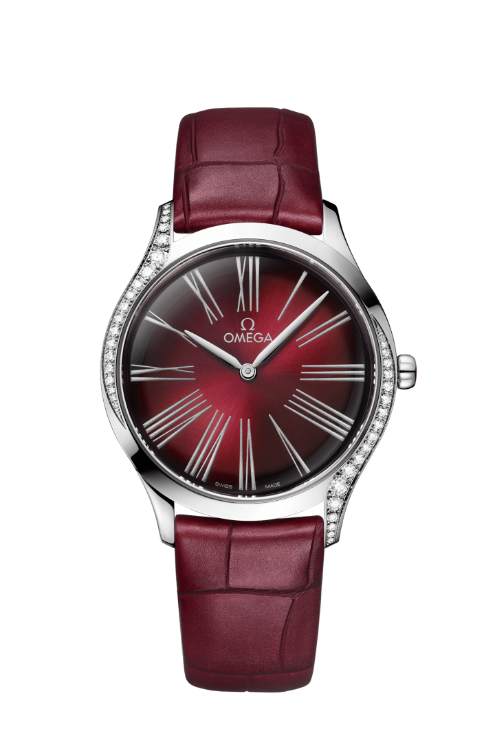 Luxusné hodinky Omega De Ville Trésor Diamanty, Quartz, 36 mm. Základné parametre hodín sú: typ strojčeka je Quartz hodinky, materiál remienka je koža, vode odolnosť je 30 m a farba ciferníka je červená.