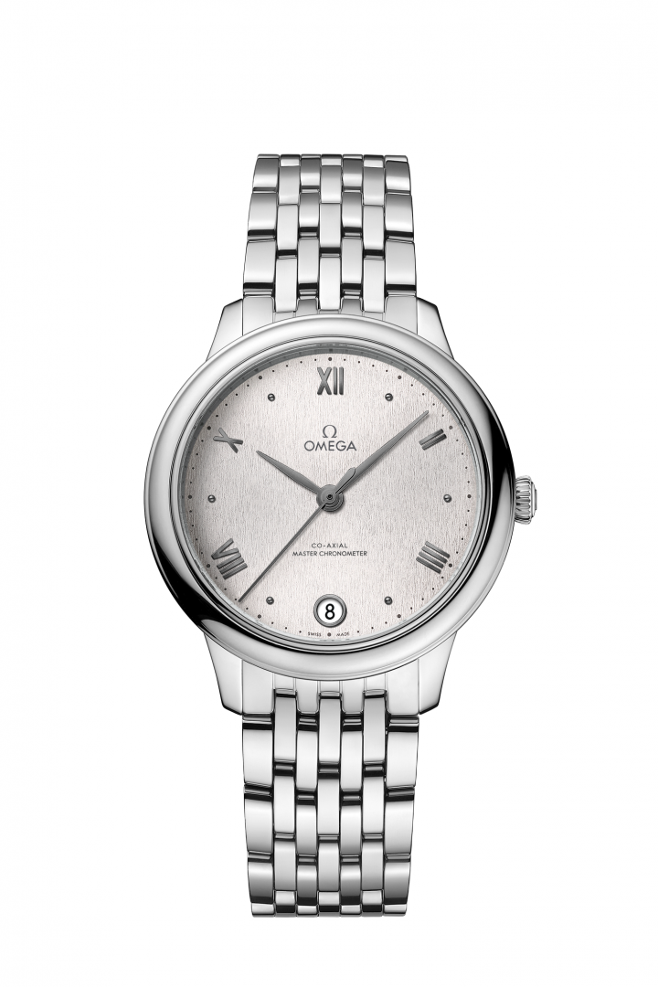 luxusné hodinky Omega De Ville Prestige Automat, 34 mm. Hodinky disponujú funkciami ukazovateľ dátumu. Základné parametre hodín sú: farba ciferníka je strieborná, typ strojčeka je mechanické hodinky s automatickým náťahom, materiál remienka je oceľ a vode odolnosť je 30 m.