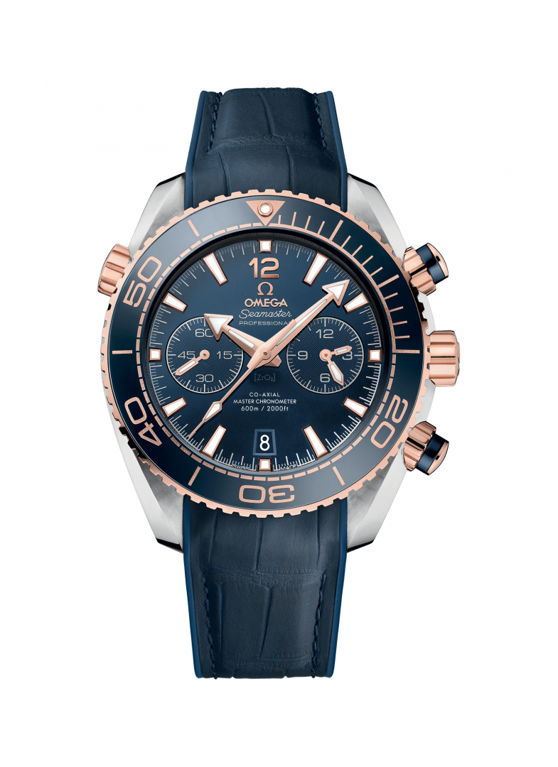 Luxusné hodinky Omega Seamaster Planet Ocean 600M Sedna™ Gold, Automat, Vodotěsnost 600M, 45.5 mm. Hodinky disponujú funkciami duálny čas, heliový ventil, luminiscencia, stopky a ukazovateľ dátumu. Základné parametre hodín sú: farba ciferníka je modrá, typ strojčeka je mechanický chronograf s automatickým náťahom, vode odolnosť je 600 m a materiál remienka je kaučuk a koža.