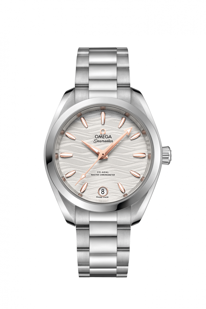 Luxusné hodinky Omega Seamaster Aqua Terra 150M Manufaktúrny kaliber, Vode odolnosť 150M, 34mm. Hodinky disponujú funkciami luminiscencia a ukazovateľ dátumu. Základné parametre hodín sú: typ strojčeka je mechanické hodinky s automatickým náťahom, vode odolnosť je 150 m, farba ciferníka je strieborná a materiál remienka je oceľ.