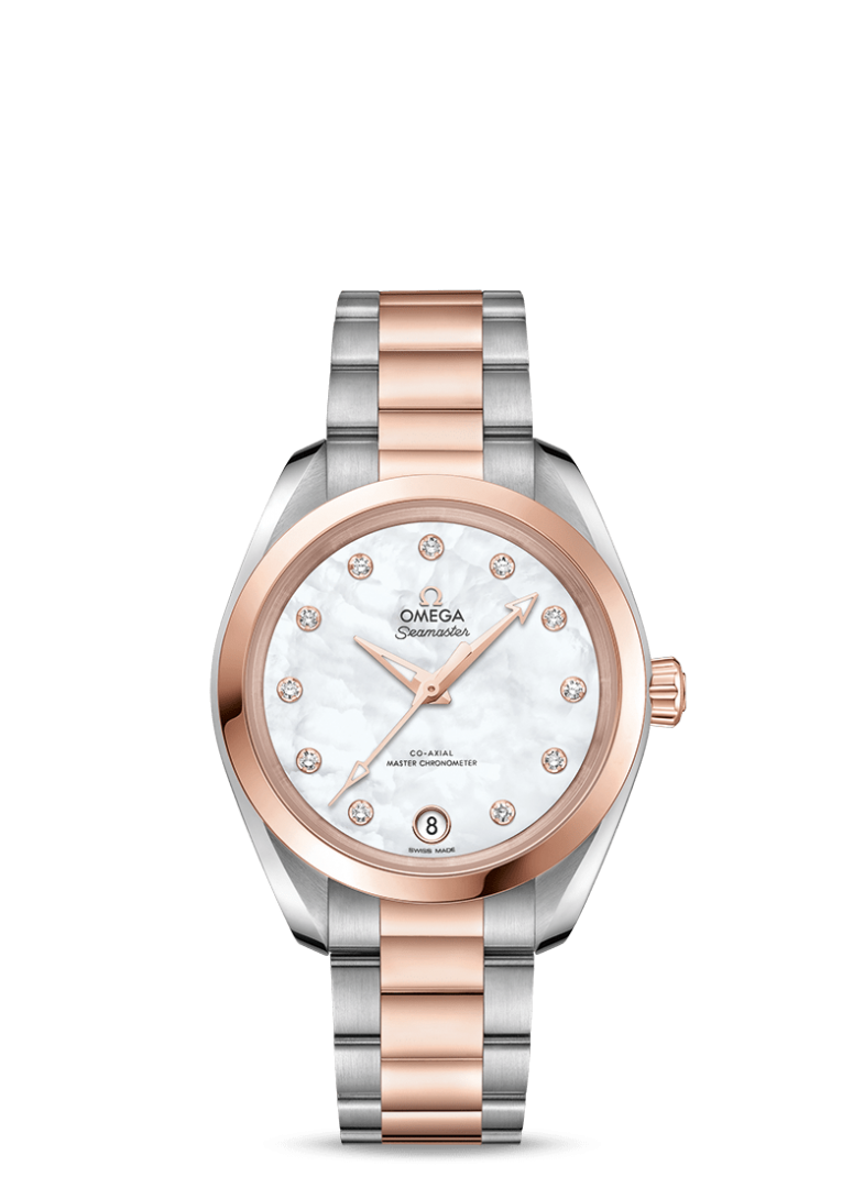 Luxusné hodinky Omega Seamaster Aqua Terra 150M Zlato&Diamanty, Manufaktúrny kaliber, 34 mm. Hodinky disponujú funkciami luminiscencia a ukazovateľ dátumu. Základné parametre hodín sú: vode odolnosť je 150 m, typ strojčeka je mechanické hodinky s automatickým nátahem, materiál remienka je oceľ a farba ciferníka je perleť.