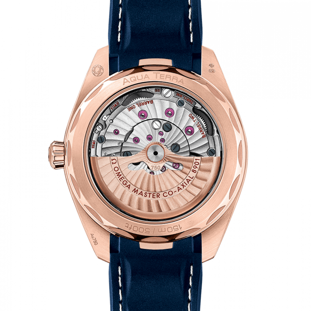 Luxusné hodinky Omega Seamaster Aqua Terra 150M Sedna™ gold, Manufaktúrni kalibr, 41 mm. Hodinky disponujú funkciami luminiscencia a ukazovateľ dátumu. Základné parametre hodín sú: farba ciferníka je modrá, typ strojčeka je mechanické hodinky s automatickým náťahom, materiál remienka je kaučuk a vode odolnosť je 150 m.