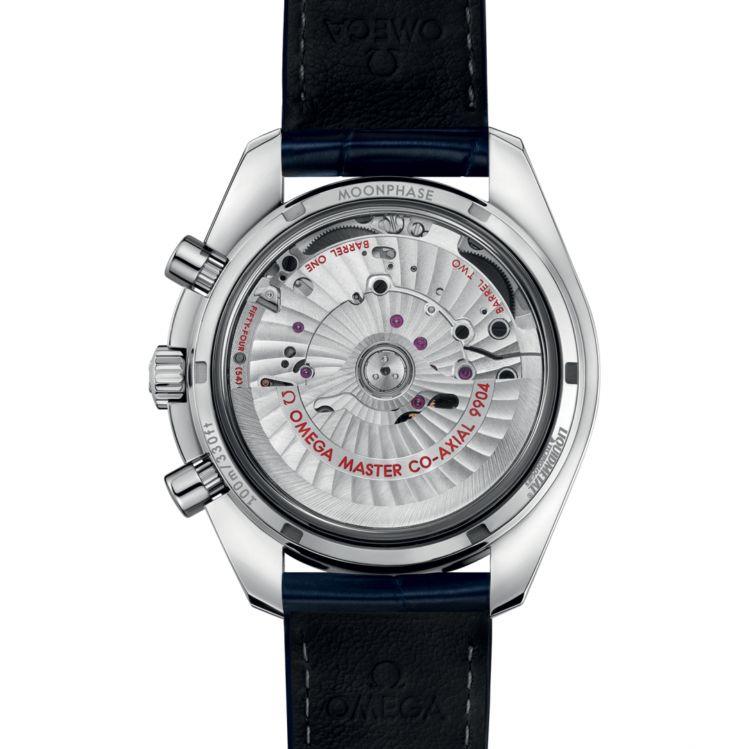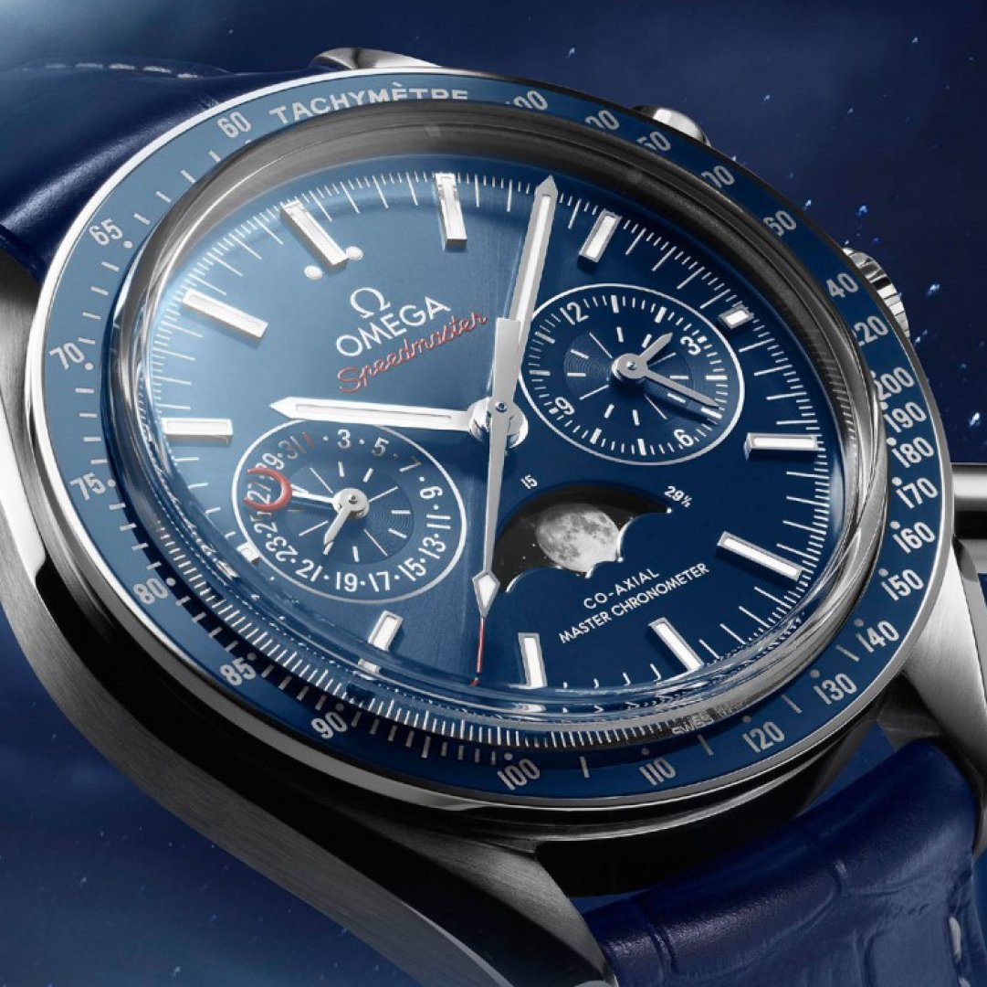 Luxusné hodinky Omega Speedmaster Moonwatch Mesačné fázy, Automat Chronograf, 44.25 mm. Hodinky disponujú funkciami luminiscence, měsíční fáze, stopky, tachymetr a ukazatel data. Základné parametre hodín sú: farba ciferníka je modrá, materiál remienka je koža, vode odolnosť je 100 m a typ strojčeka je mechanický chronograf s automatickým náťahom.