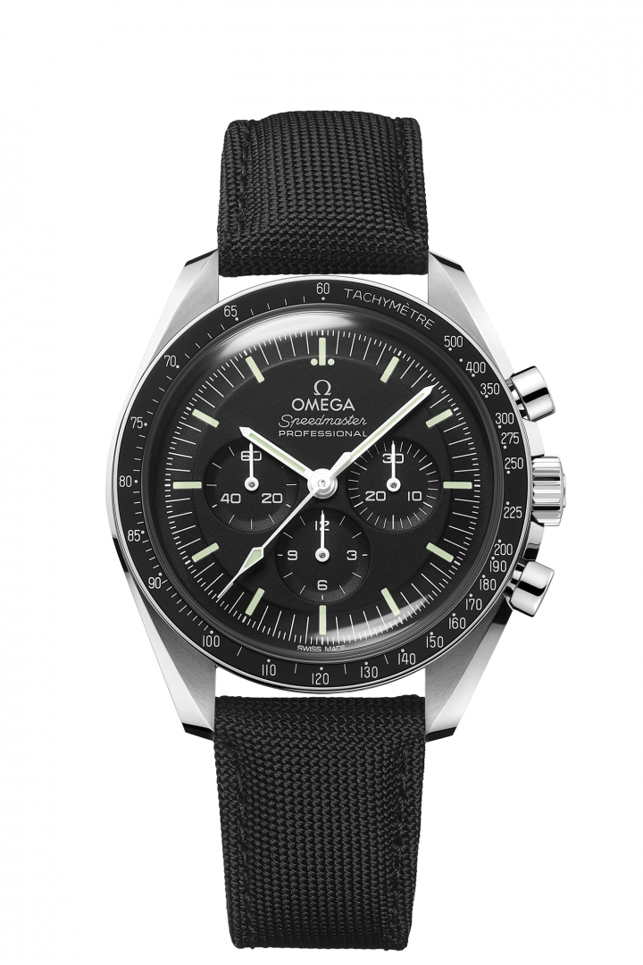 Luxusné hodinky Omega Speedmaster Moonwatch Professional Ručný náťah, 42 mm. Hodinky disponujú funkciami luminiscencia, stopky a tachymeter. Základné parametre hodín sú: farba ciferníka je čierna, typ strojčeka je mechanický chronograf s ručným náťahom, vode odolnosť je 50 m a materiál remienka je textil a nylon.