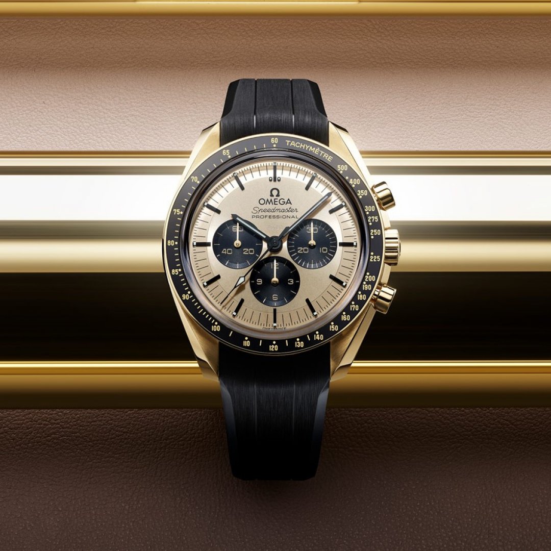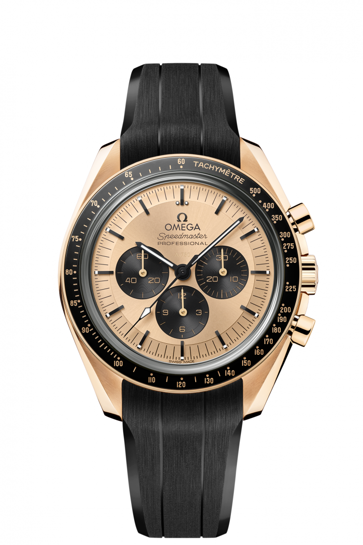 luxusné hodinky Omega Speedmaster Moonwatch Professional Moonshine™ gold, Ručný náťah, 42 mm. Hodinky disponujú funkciami luminiscencia, stopky a tachymeter. Základné parametre hodín sú: farba ciferníka je čierna a zlatá, typ strojčeka je mechanický chronograf s ručným náťahom, vode odolnosť je 50 m a materiál remienka je kaučuk.