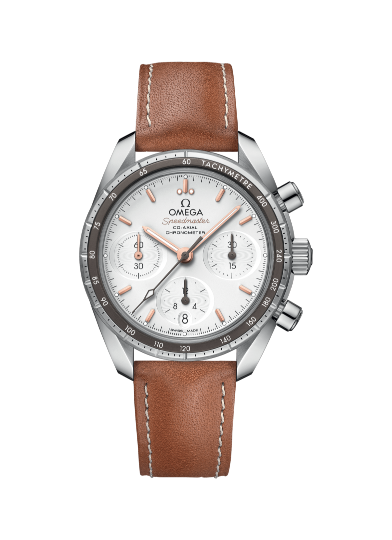 Luxusné hodinky Omega Speedmaster Automat, 38mm, Chronographe. Hodinky disponujú funkciami luminiscencia, stopky, ukazovateľ dátumu a rezerva chodu. Základné parametre hodín sú: farba ciferníka je biela, typ strojčeka je mechanický chronograf s automatickým nátahem, materiál remienka je koža a vode odolnosť je 100 m.