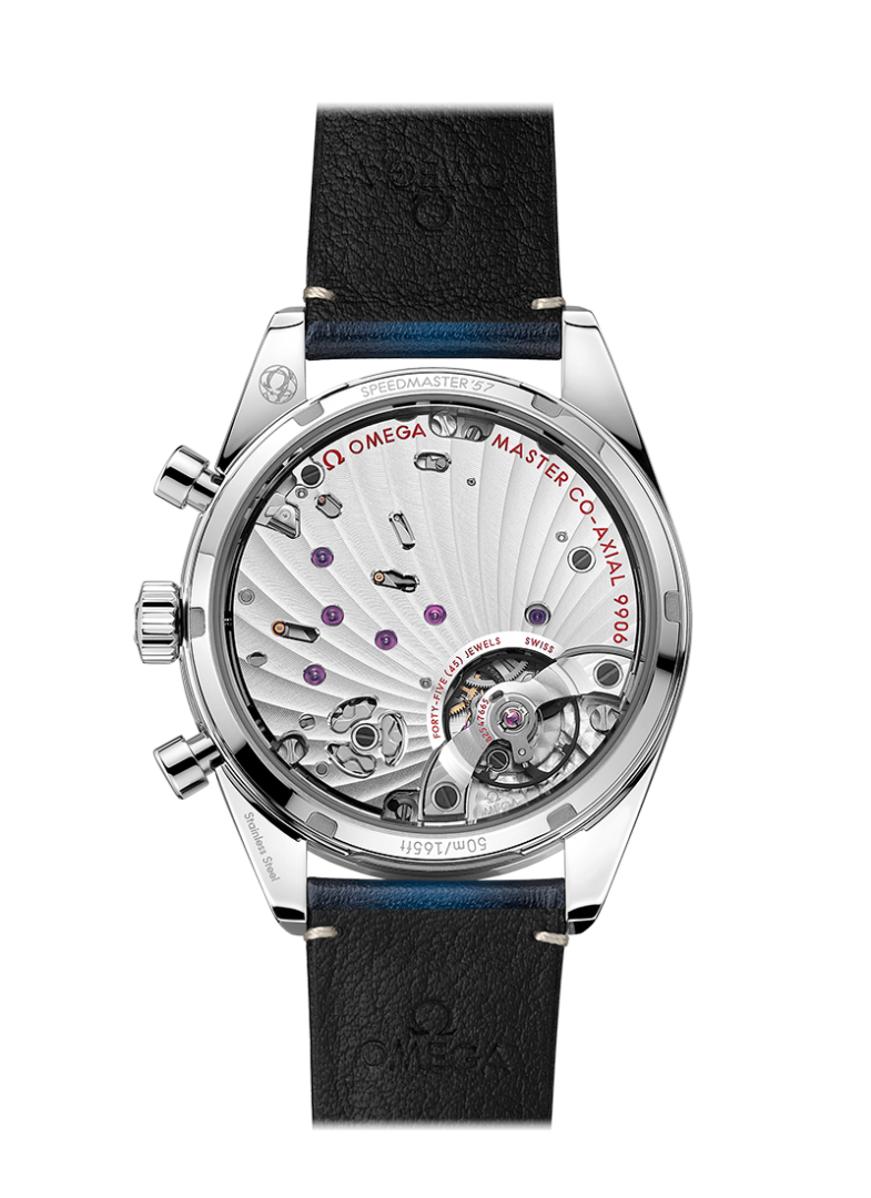 luxusné hodinky Omega Speedmaster '57 Ručný náťah, 42 mm. Hodinky disponujú funkciami luminiscencia, stopky, tachymeter a ukazovateľ dátumu. Základné parametre hodín sú: typ strojčeka je mechanický chronograf s ručným náťahom, vode odolnosť je 50 m, materiál remienka je koža a farba ciferníka je modrá.