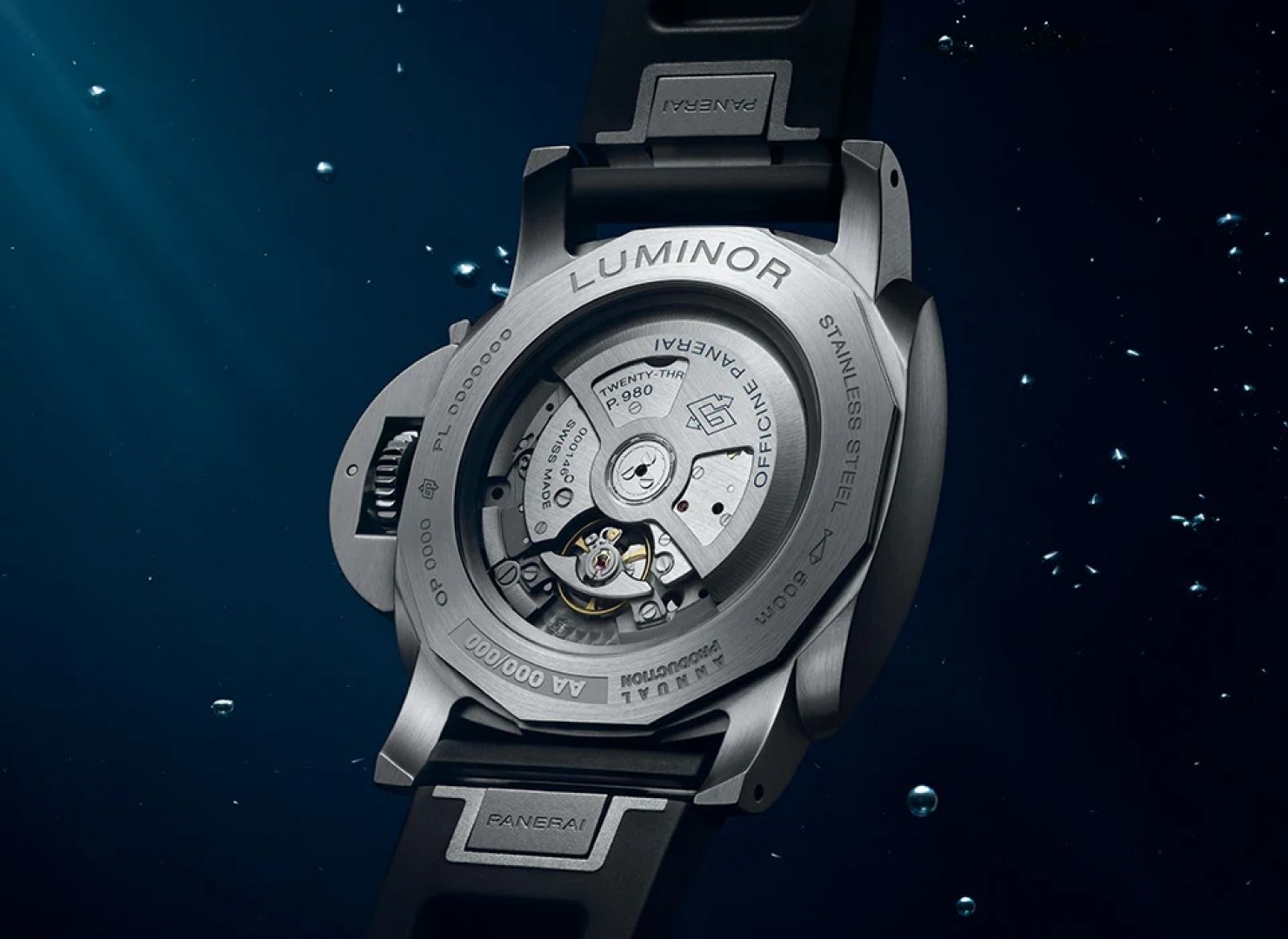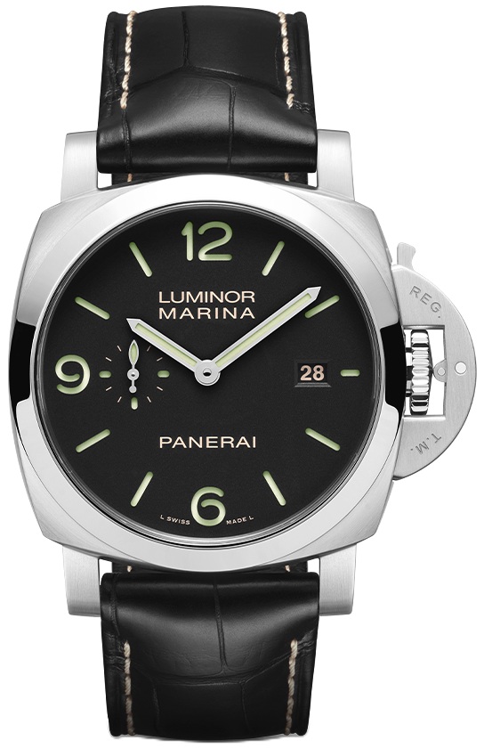 luxusné hodinky Panerai Luminor Marina Manufaktúrny kaliber, Vode odolnosť 500M, 44 mm. Hodinky disponujú funkciami luminiscencia a ukazovateľ dátumu. Základné parametre hodín sú: typ strojčeka je mechanické hodinky s automatickým náťahom, materiál remienka je koža a kaučuk, farba ciferníka je čierna a vode odolnosť je 500 m.