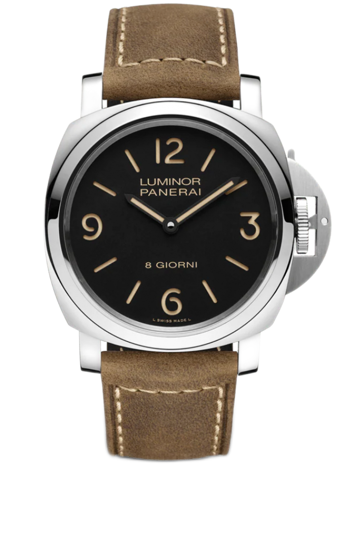 luxusné hodinky Panerai Luminor 8 Giorni Ručný náťah, 44 mm. Hodinky disponujú funkciami luminiscencia. Základné parametre hodín sú: farba ciferníka je čierna, typ strojčeka je mechanické hodinky s ručným náťahom, materiál remienka je koža a vode odolnosť je 300 m.