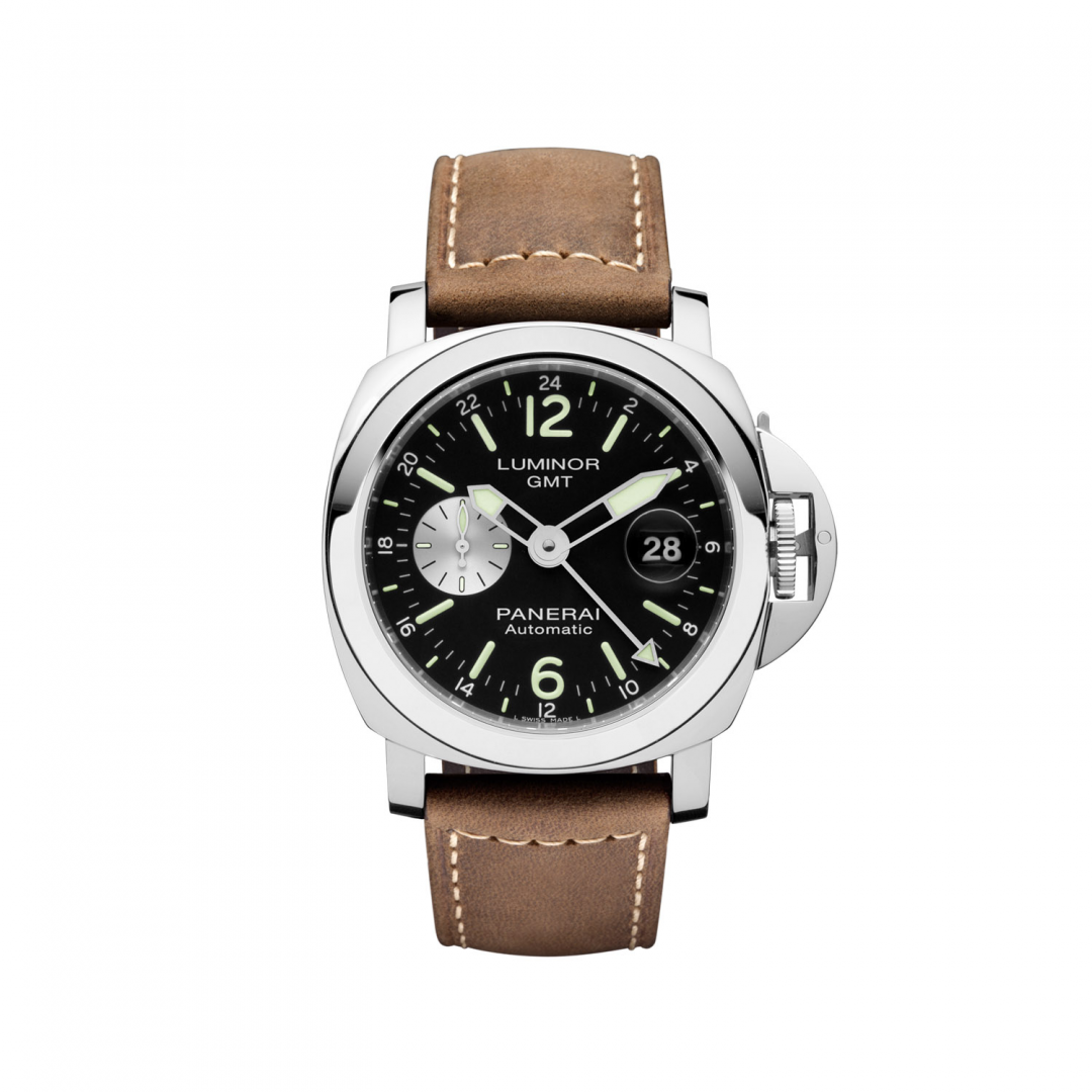 Luxusné hodinky Panerai Luminor GMT Automat, Chronometer, 44 mm. Hodinky disponujú funkciami duálny čas, luminiscencia a ukazovateľ dátumu. Základné parametre hodín sú: farba ciferníka je čierna, typ strojčeka je mechanické hodinky s automatickým náťahom, materiál remienka je koža a vode odolnosť je 300 m.