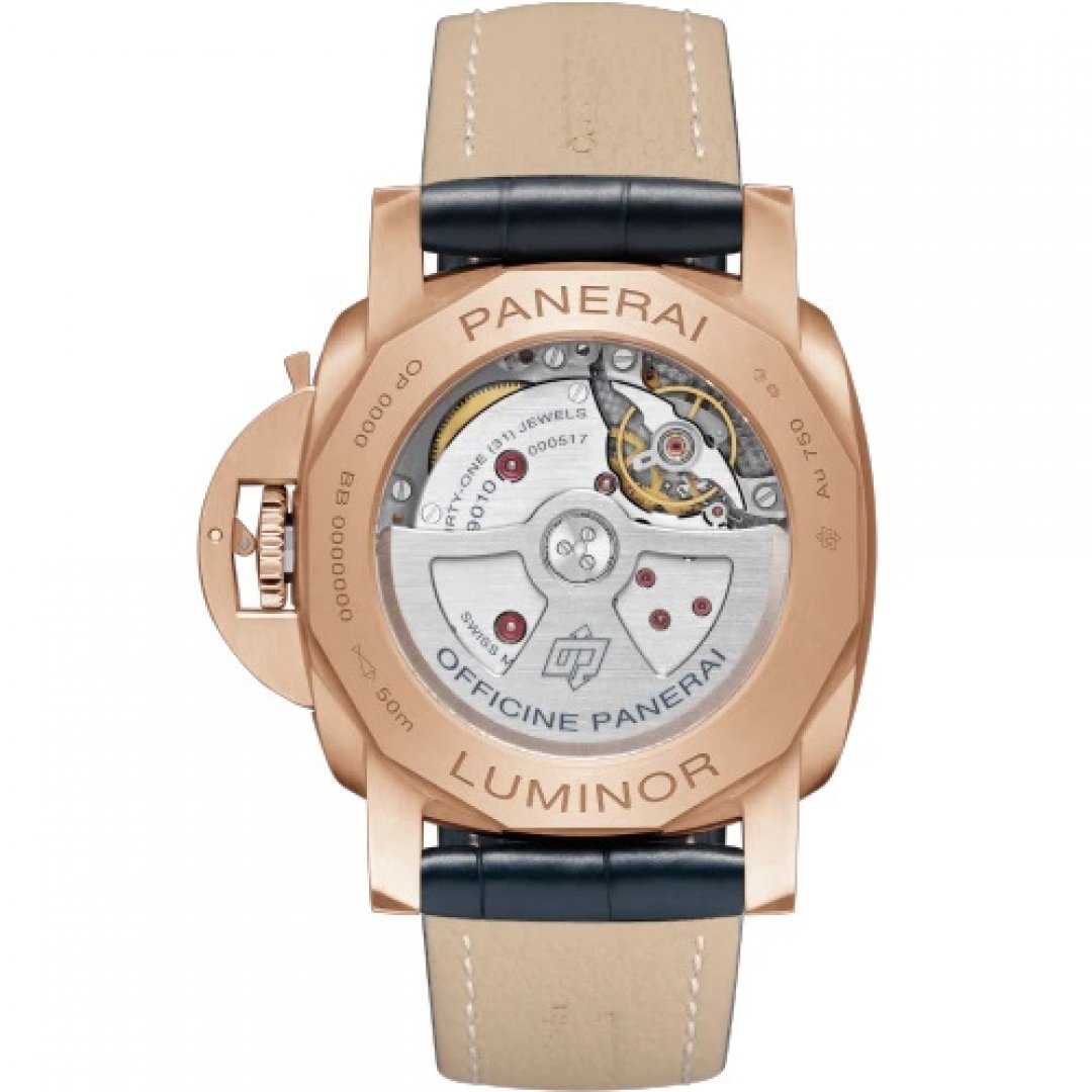 luxusné hodinky Panerai Luminor Marina Goldtech™ Sole Blu Goldtech™, 44 mm. Hodinky disponujú funkciami duálny čas, luminiscencia a ukazovateľ dátumu. Základné parametre hodín sú: typ strojčeka je mechanické hodinky s automatickým náťahom, materiál remienka je koža, vode odolnosť je 100 m a farba ciferníka je modrá.
