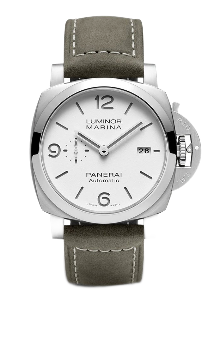 luxusné hodinky Panerai Luminor Marina Manufaktúrny kaliber, 44 mm. Hodinky disponujú funkciami luminiscencia a ukazovateľ dátumu. Základné parametre hodín sú: vode odolnosť je 300 m, typ strojčeka je mechanické hodinky s automatickým náťahom, materiál remienka je oceľ a farba ciferníka je biela.