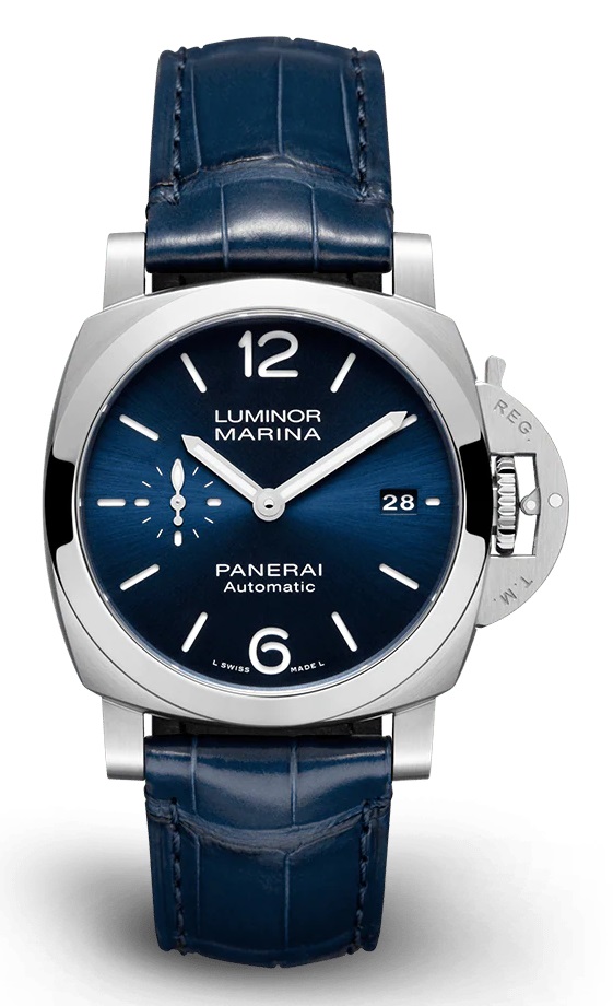 luxusné hodinky Panerai Luminor Quaranta Manufaktúrny kaliber, 40 mm. Hodinky disponujú funkciami luminiscencia a ukazovateľ dátumu. Základné parametre hodín sú: typ strojčeka je mechanické hodinky s automatickým náťahom, materiál remienka je koža, vode odolnosť je 100 m a farba ciferníka je modrá.