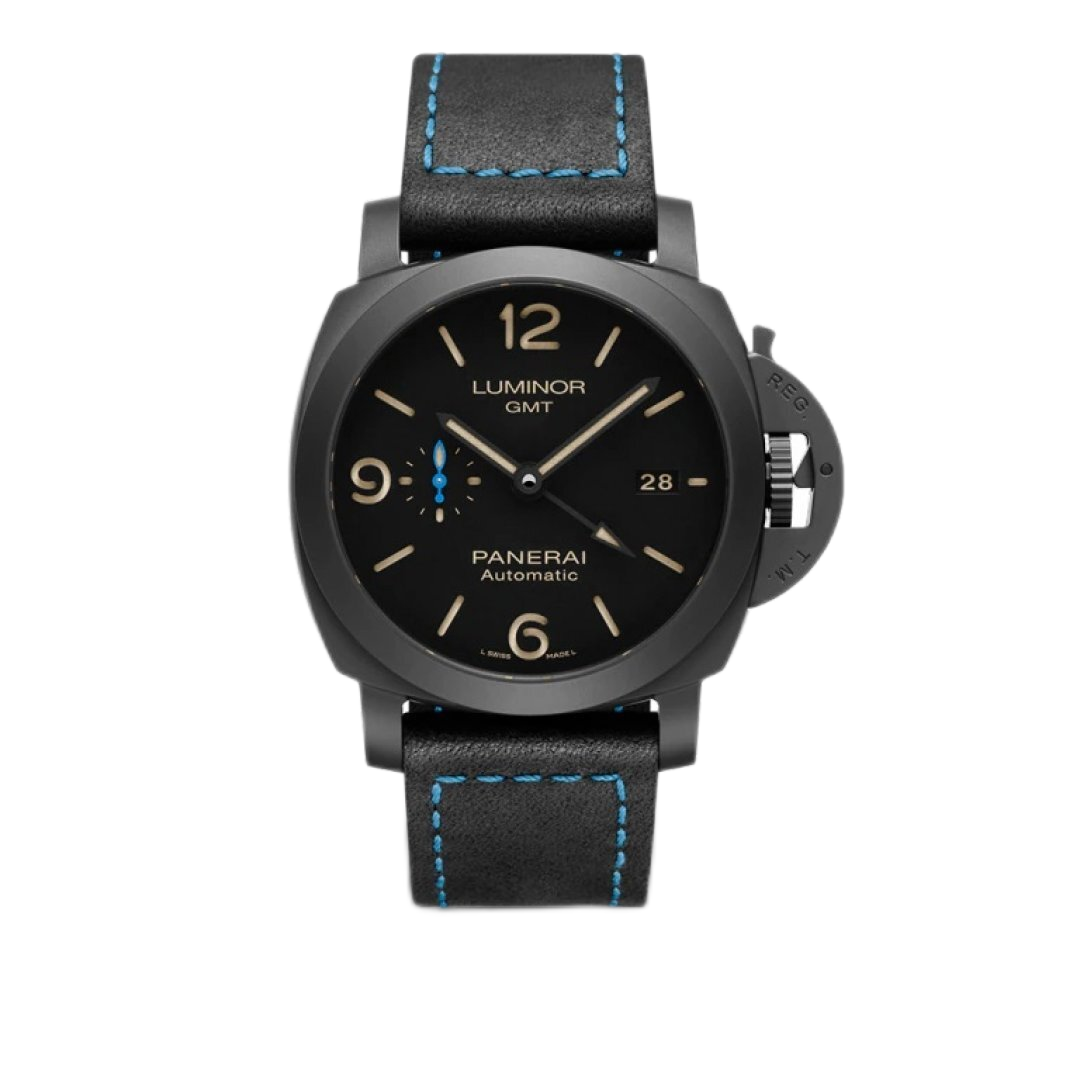 luxusné hodinky Panerai Luminor GMT Keramické puzdro, 44 mm. Hodinky disponujú funkciami duálny čas, luminiscencia a ukazovateľ dátumu. Základné parametre hodín sú: farba ciferníka je čierna, typ strojčeka je mechanické hodinky s automatickým náťahom, materiál remienka je koža a vode odolnosť je 100 m.