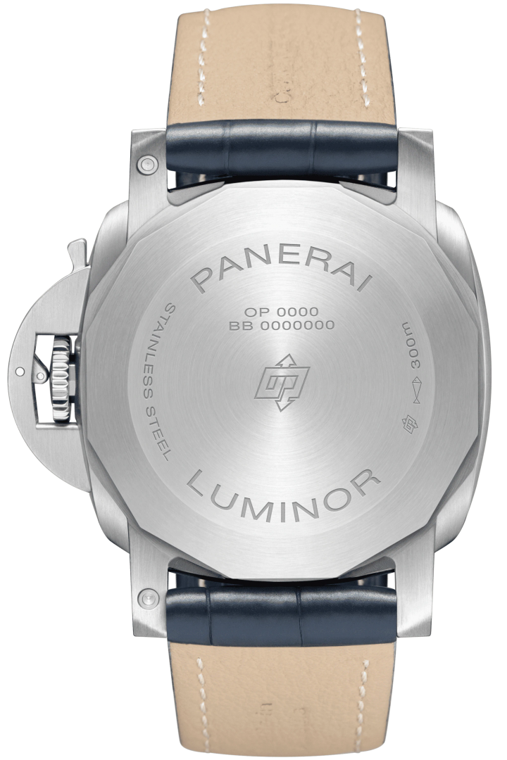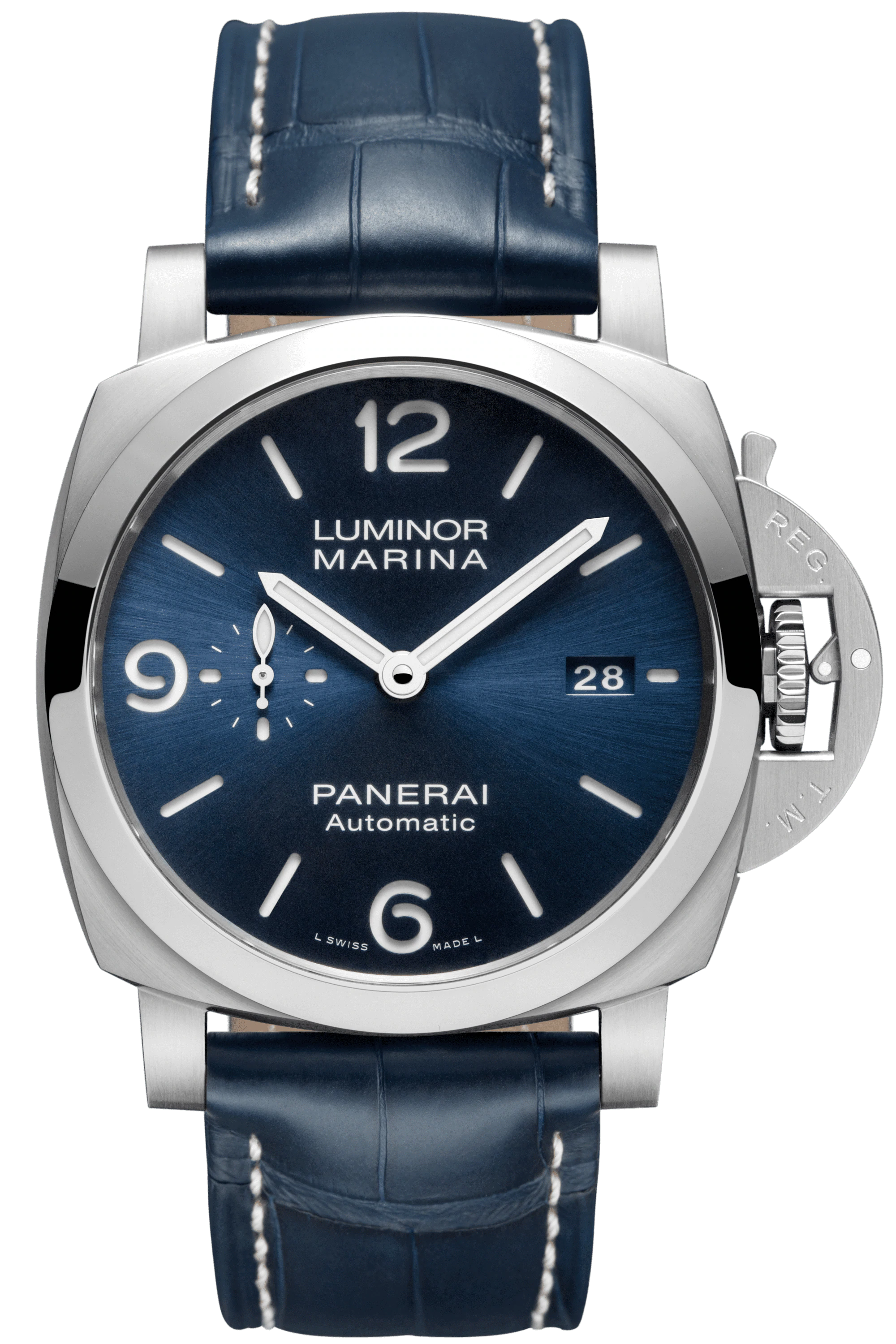 luxusné hodinky Panerai Luminor Marina Manufaktúrny kaliber, Vode odolnosť 500M, 44 mm. Hodinky disponujú funkciami luminiscencia a ukazovateľ dátumu. Základné parametre hodín sú: typ strojčeka je mechanické hodinky s automatickým náťahom, materiál remienka je koža a kaučuk, farba ciferníka je modrá a vode odolnosť je 500 m.