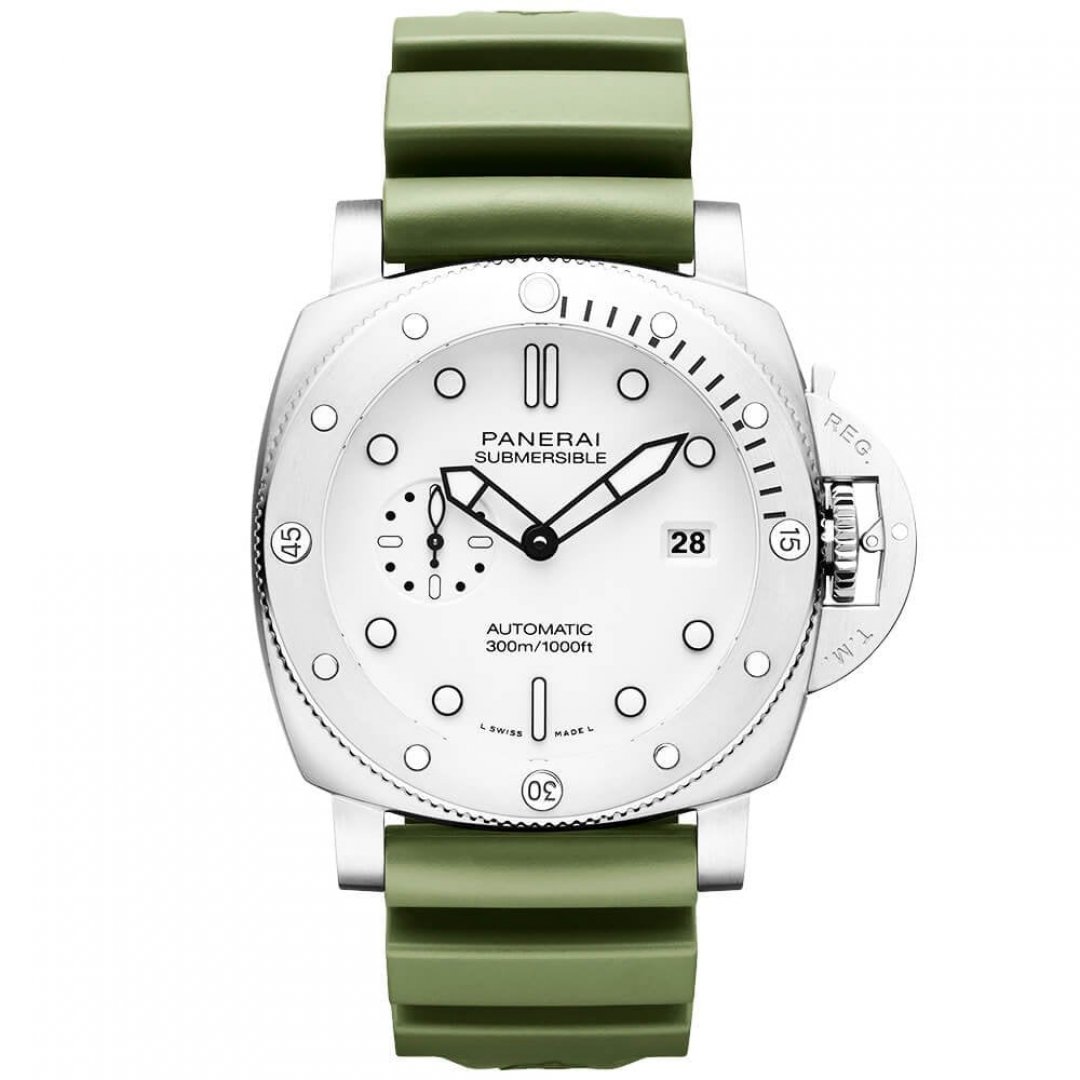 luxusné hodinky Panerai Submersible QUARANTA QUATTRO BIANCO Manufaktúrny kaliber, Vode odolnosť 300M, 44 mm. Hodinky disponujú funkciami luminiscencia a ukazovateľ dátumu. Základné parametre hodín sú: farba ciferníka je biela, typ strojčeka je mechanické hodinky s automatickým náťahom, materiál remienka je kaučuk a vode odolnosť je 300 m.