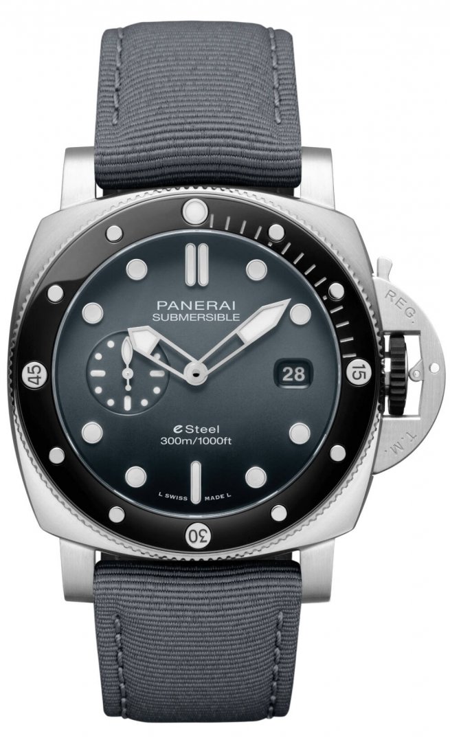 luxusné hodinky Panerai Submersible QUARANTA QUATTRO GRIGIO ROCCIA Manufaktúrny kaliber, Vode odolnosť 300M, 44 mm. Hodinky disponujú funkciami luminiscencia a ukazovateľ dátumu. Základné parametre hodín sú: typ strojčeka je mechanické hodinky s automatickým náťahom, vode odolnosť je 300 m, materiál remienka je textil a farba ciferníka je šedá.