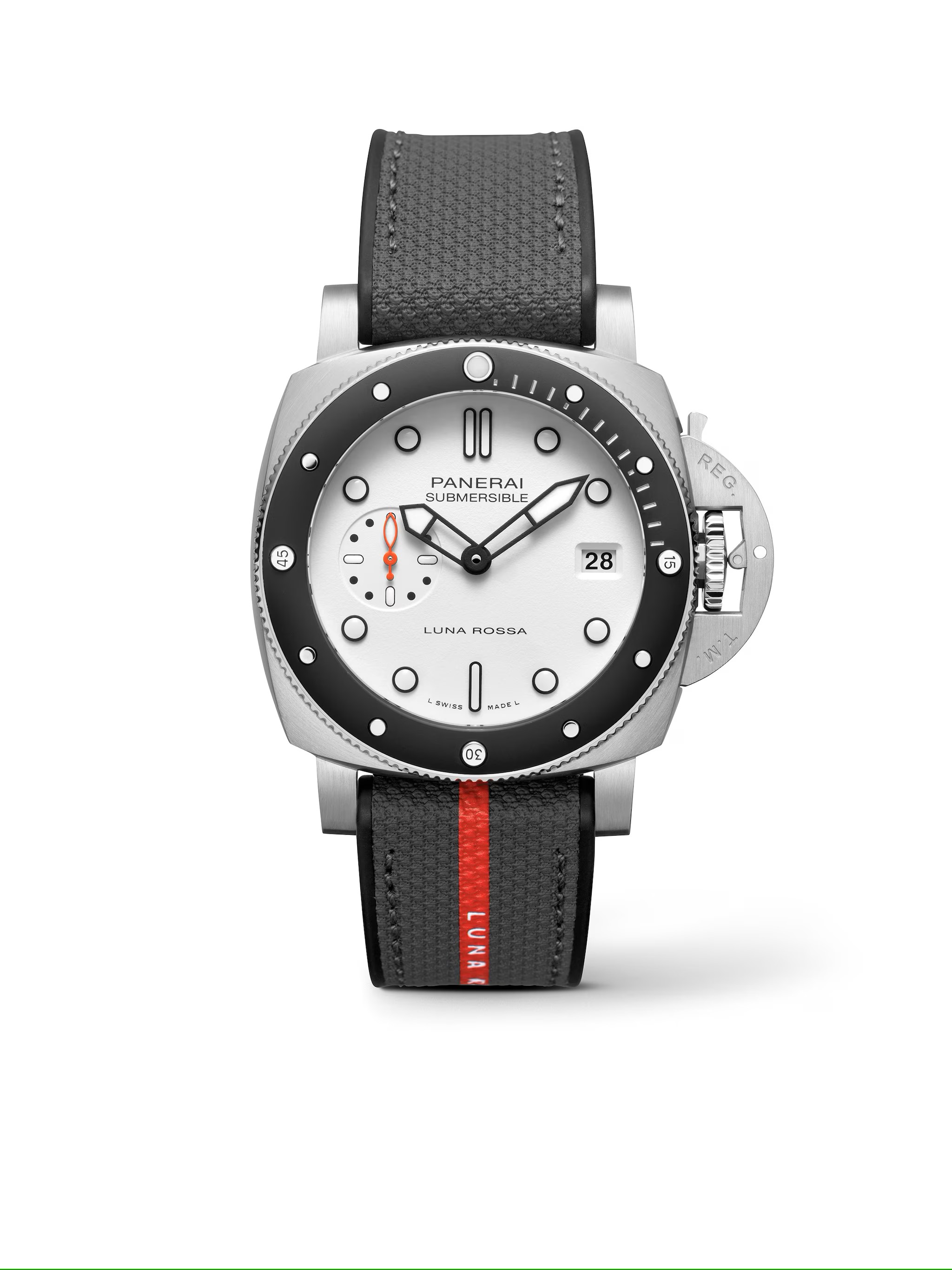 luxusné hodinky Panerai Submersible Luna Rossa Manufaktúrny kaliber, 42 mm. Hodinky disponujú funkciami luminiscencia a ukazovateľ dátumu. Základné parametre hodín sú: typ strojčeka je mechanické hodinky s automatickým náťahom, vode odolnosť je 30 m, farba ciferníka je biela a materiál remienka je kaučuk.