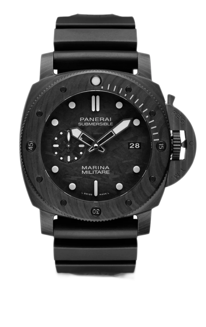 luxusné hodinky Panerai Submersible Marina Militare Carbotech™ Manufaktúrny kaliber, Vode odolnosť 300M, 47 mm. Hodinky disponujú funkciami luminiscencia a ukazovateľ dátumu. Základné parametre hodín sú: farba ciferníka je čierna, typ strojčeka je mechanické hodinky s automatickým náťahom, materiál remienka je kaučuk a vode odolnosť je 300 m.