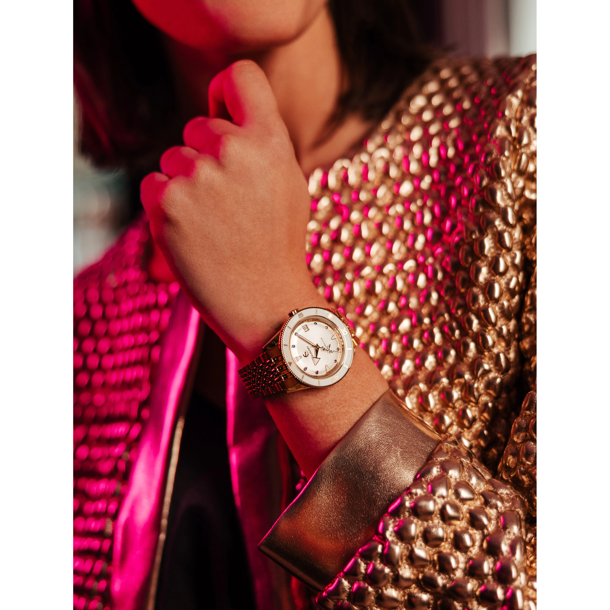 luxusné hodinky Rado Captain Cook x Marina Hoermanseder Heartbeat Automat, Vode odolnosť 100M, 37 mm. Hodinky disponujú funkciami luminiscencia a ukazovateľ dátumu. Základné parametre hodín sú: typ strojčeka je mechanické hodinky s automatickým náťahom, materiál remienka je oceľ a koža, vode odolnosť je 100 m a farba ciferníka je biela.