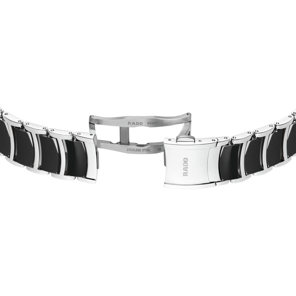 - Náramok: kombinácia leštenej ocele a čiernej high-tech keramiky, motýlková spona z kartáčovanej ocele