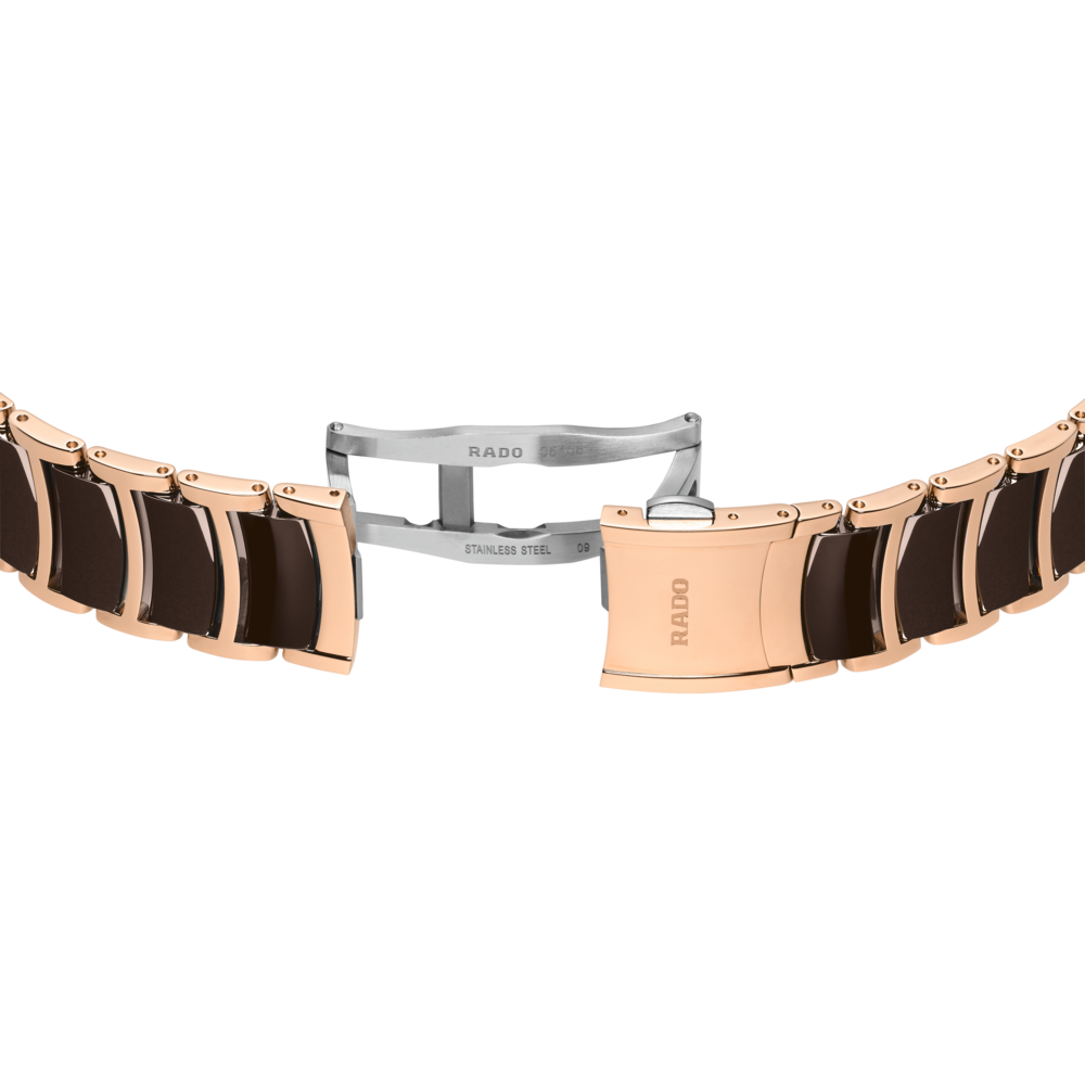 - Náramok: kombinácia ocele a keramiky v odtieni ružového zlata, trojitá spona.