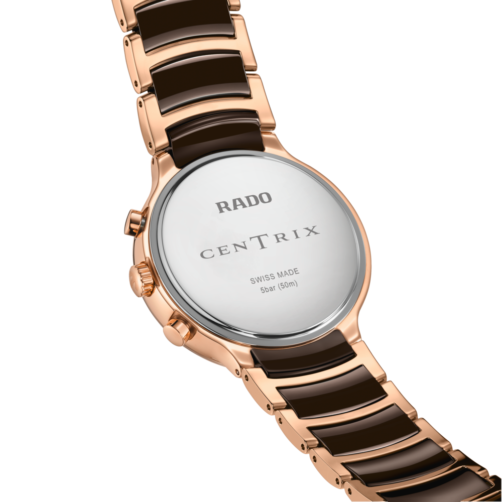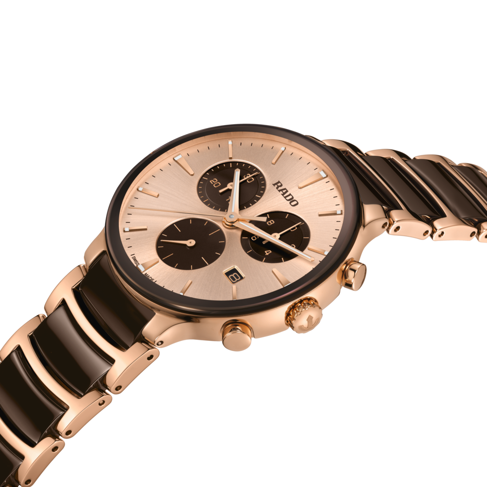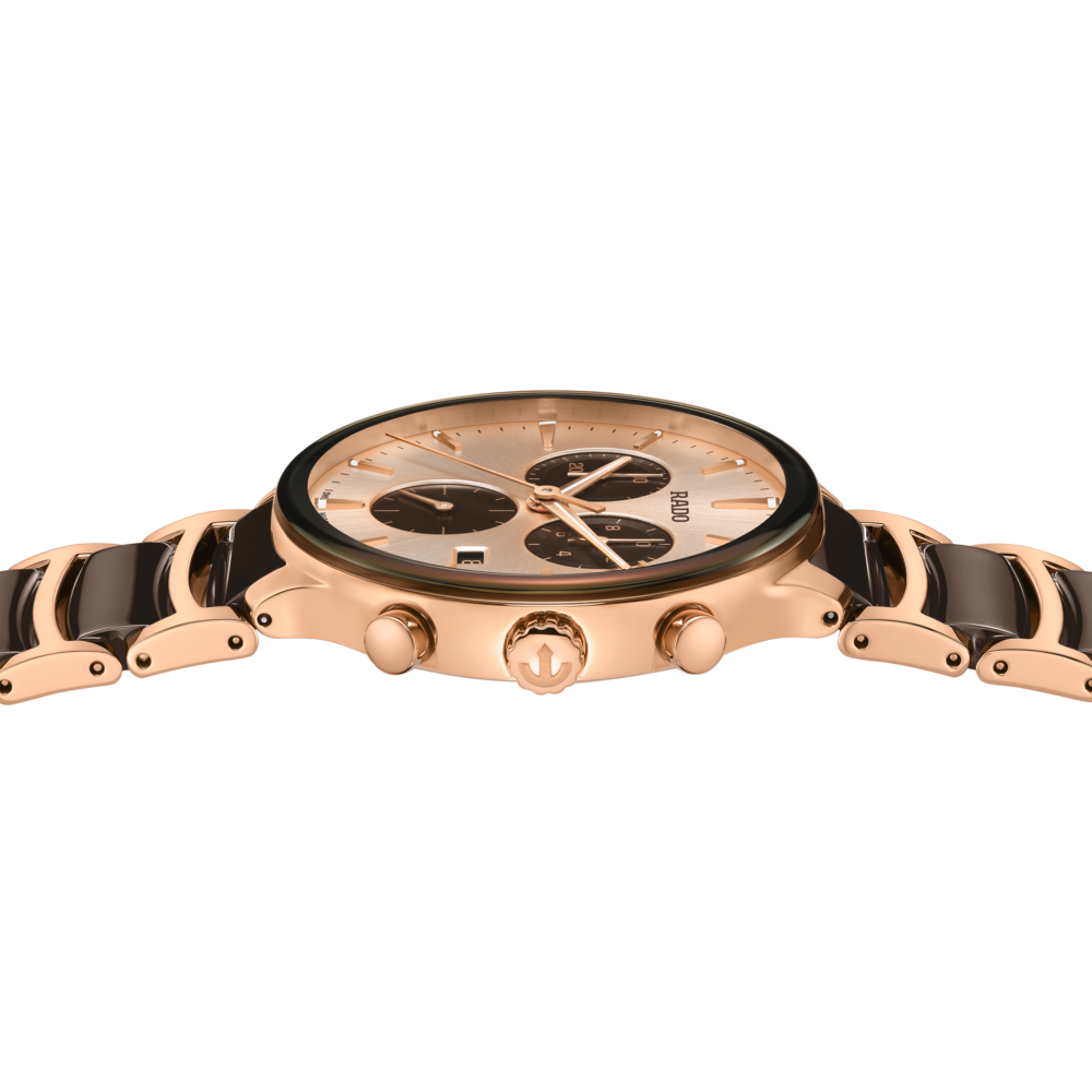 Model Centrix Chronograph R30212402 predstavuje dokonalú harmóniu medzi umeleckým dizajnom a technickou dokonalosťou. Vďaka kombinácii nerezovej ocele s PVD povrchovou úpravou v odtieni ružového zlata a detailom z high-tech keramiky je tento chronograf stelesnením luxusu a komfortu.