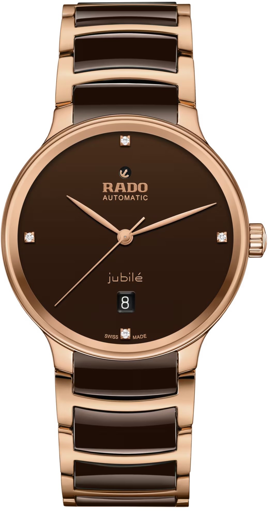 luxusné hodinky Rado Centrix Diamanty, Automat, 39.50 mm. Hodinky disponujú funkciami ukazovateľ dátumu. Základné parametre hodín sú: typ strojčeka je mechanické hodinky s automatickým náťahom, materiál remienka je keramika a oceľ, vode odolnosť je 50 m a farba ciferníka je hnědá.