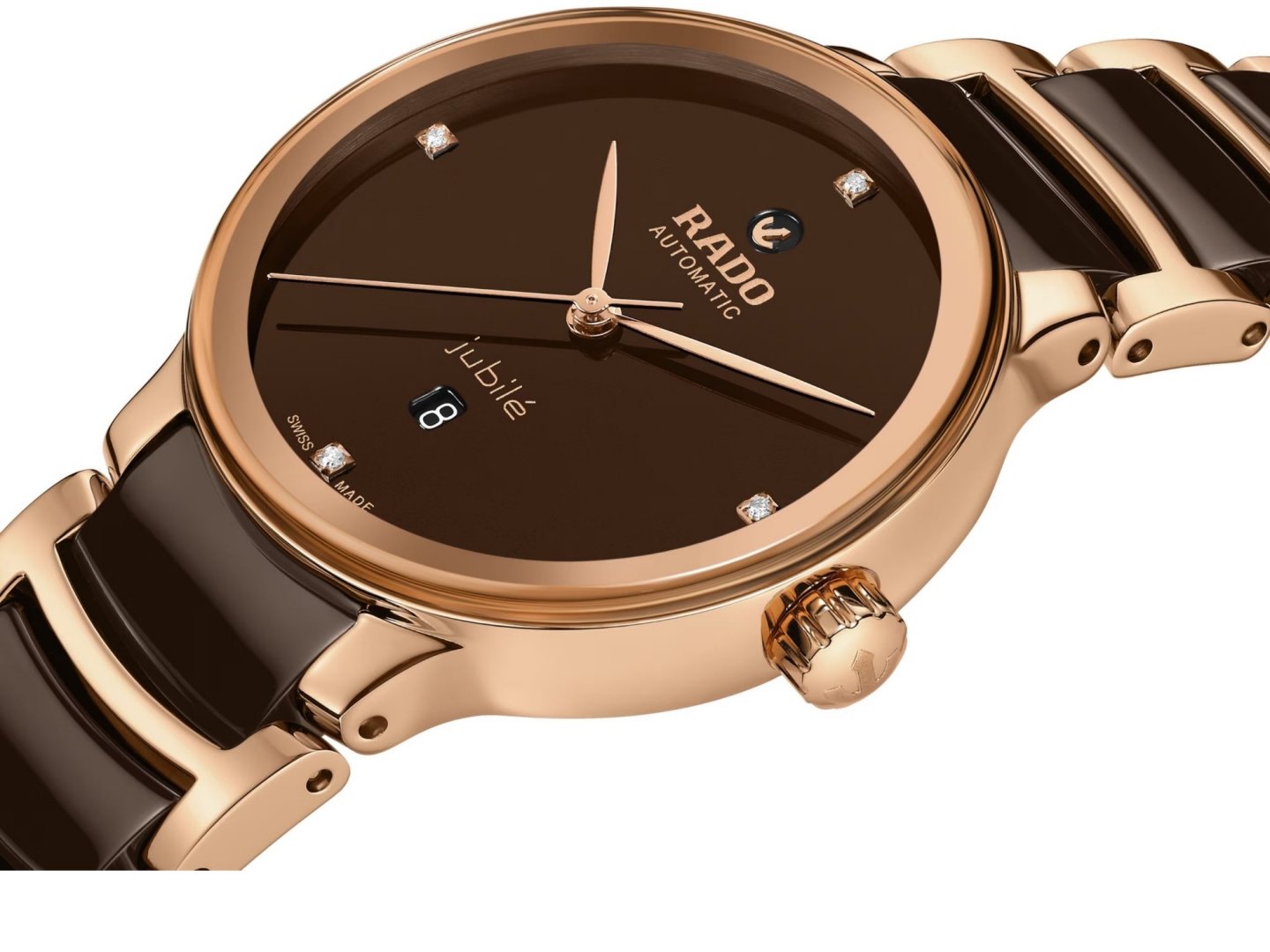 luxusné hodinky Rado Centrix Diamanty, Automat, 30.50 mm. Hodinky disponujú funkciami ukazovateľ dátumu. Základné parametre hodín sú: typ strojčeka je mechanické hodinky s automatickým náťahom, materiál remienka je keramika a oceľ, vode odolnosť je 50 m a farba ciferníka je hnědá.