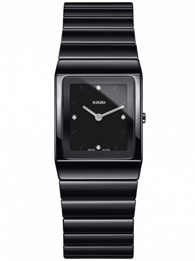 Luxusné hodinky Rado Ceramica Diamanty, Quartz, 22.9 x 31 mm. Základné parametre hodín sú: farba ciferníka je čierna, typ strojčeka je Quartz hodinky, materiál remienka je keramika a titan a vode odolnosť je 50 m.