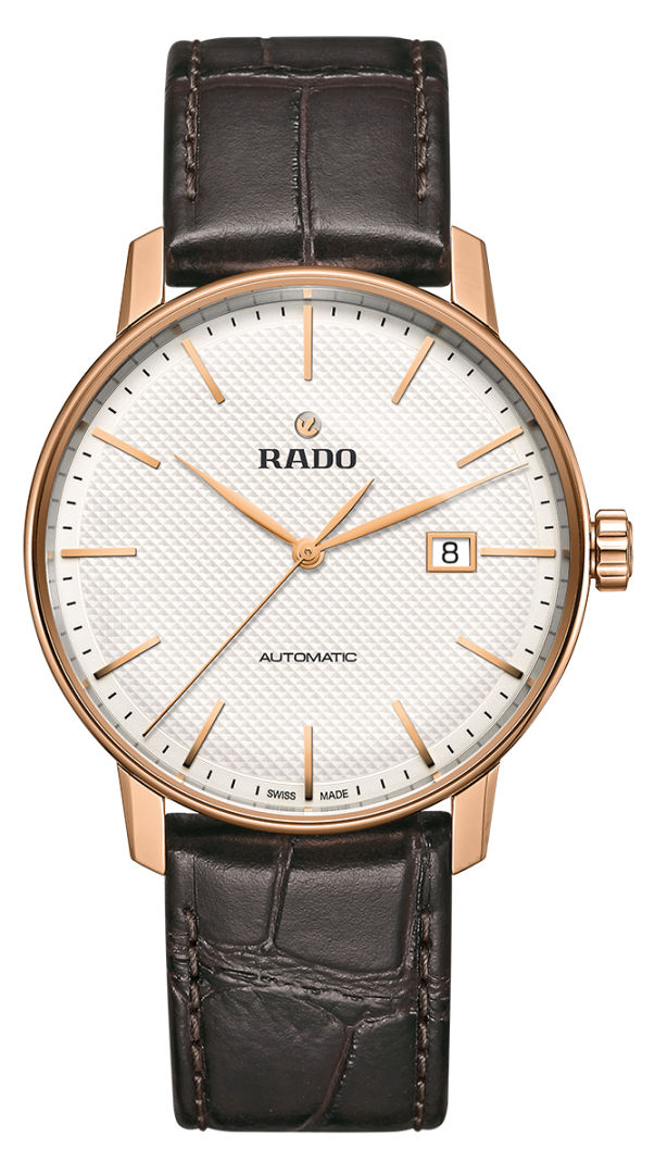 Luxusné hodinky Rado Coupole Automat, 41 mm. Hodinky disponujú funkciami ukazovateľ dátumu. Základné parametre hodín sú: farba ciferníka je biela, typ strojčeka je mechanické hodinky s automatickým náťahom, materiál remienka je koža a vode odolnosť je 50 m.