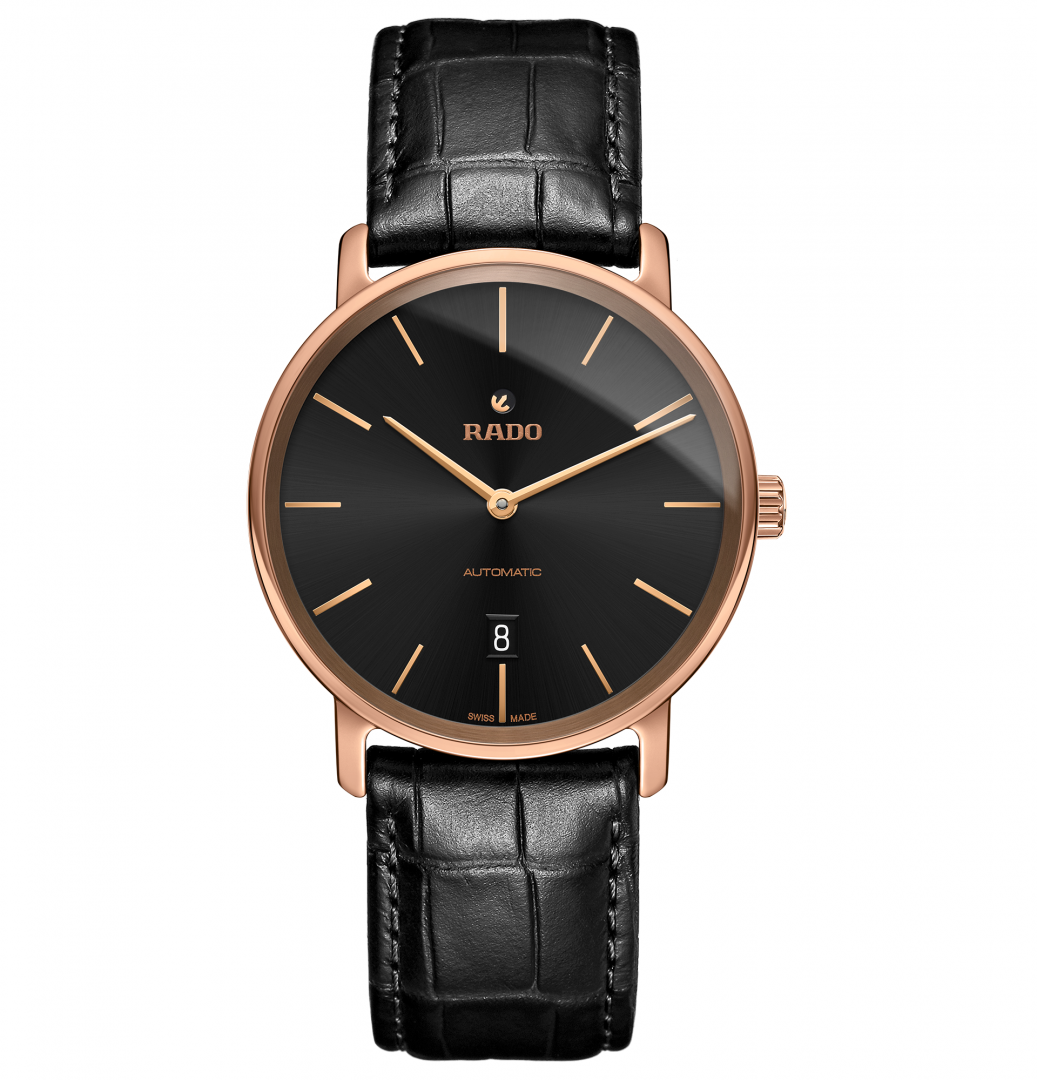 Luxusné hodinky Rado DiaMaster Thinline, Automat, 41 mm. Hodinky disponujú funkciami ukazovateľ dátumu. Základné parametre hodín sú: typ strojčeka je mechanické hodinky s automatickým náťahom, materiál remienka je koža, vode odolnosť je 50 m a farba ciferníka je čierna.