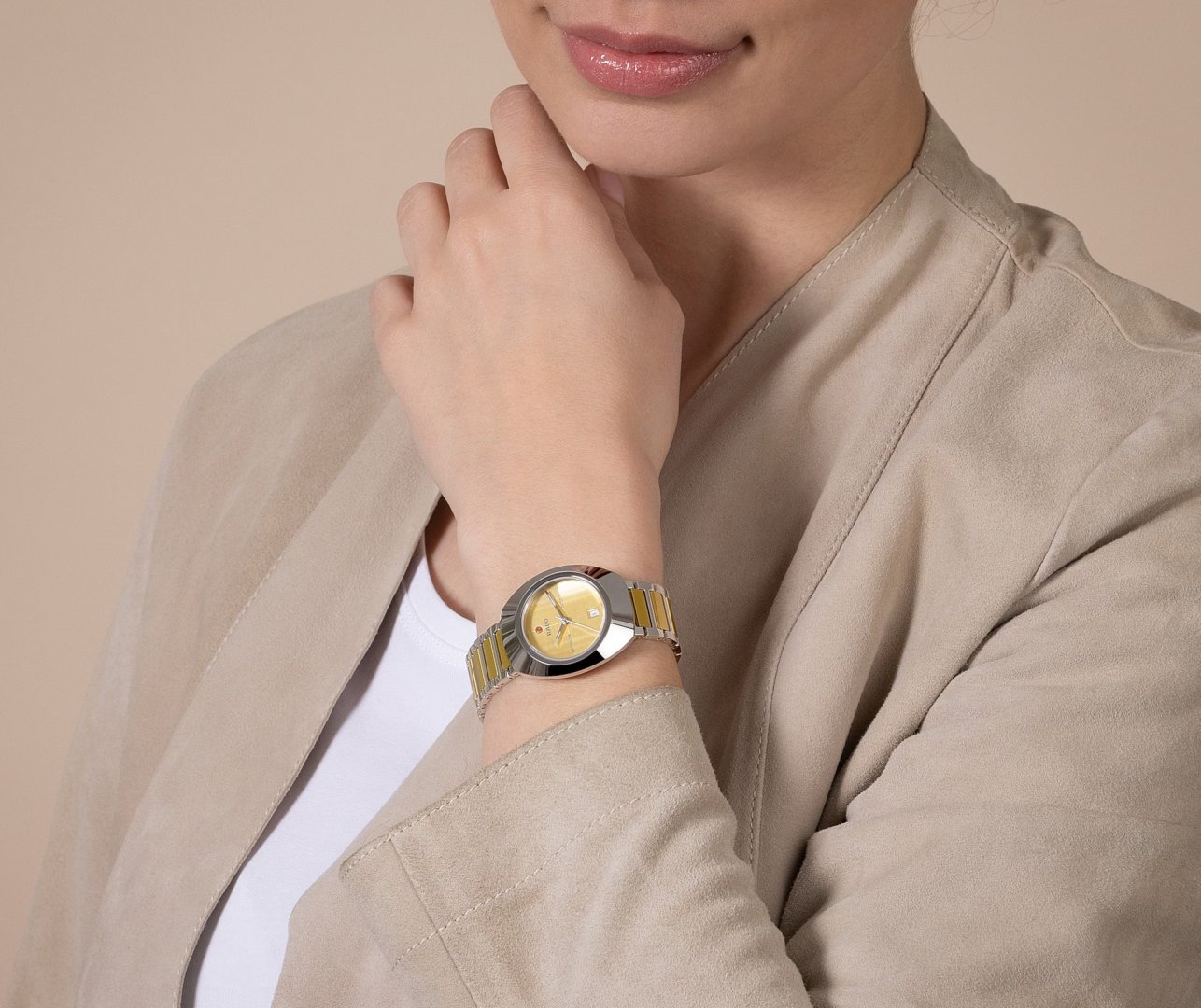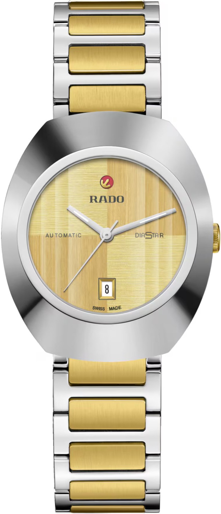 luxusné hodinky Rado DiaStar Original Automat, Vode odolnosť 100M, 30 mm. Hodinky disponujú funkciami luminiscencia a ukazovateľ dátumu. Základné parametre hodín sú: typ strojčeka je mechanické hodinky s automatickým náťahom, materiál remienka je oceľ, vode odolnosť je 100 m a farba ciferníka je zlatá.