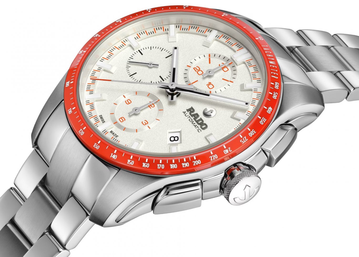 luxusné hodinky Rado Hyperchrome Automat Chronograf, Vode odolnosť 100M, 44 mm. Hodinky disponujú funkciami luminiscencia, stopky, tachymeter a ukazovateľ dátumu. Základné parametre hodín sú: typ strojčeka je mechanický chronograf s automatickým náťahom, vode odolnosť je 100 m, materiál remienka je oceľ a titan a farba ciferníka je biela.