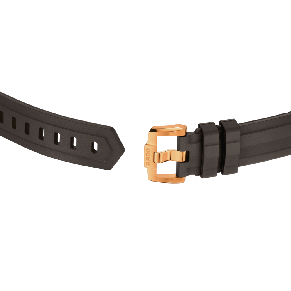 - Remienok: hnedý kaučukový náramok s PVD prackou v odtieni ružového zlata – pohodlný a odolný