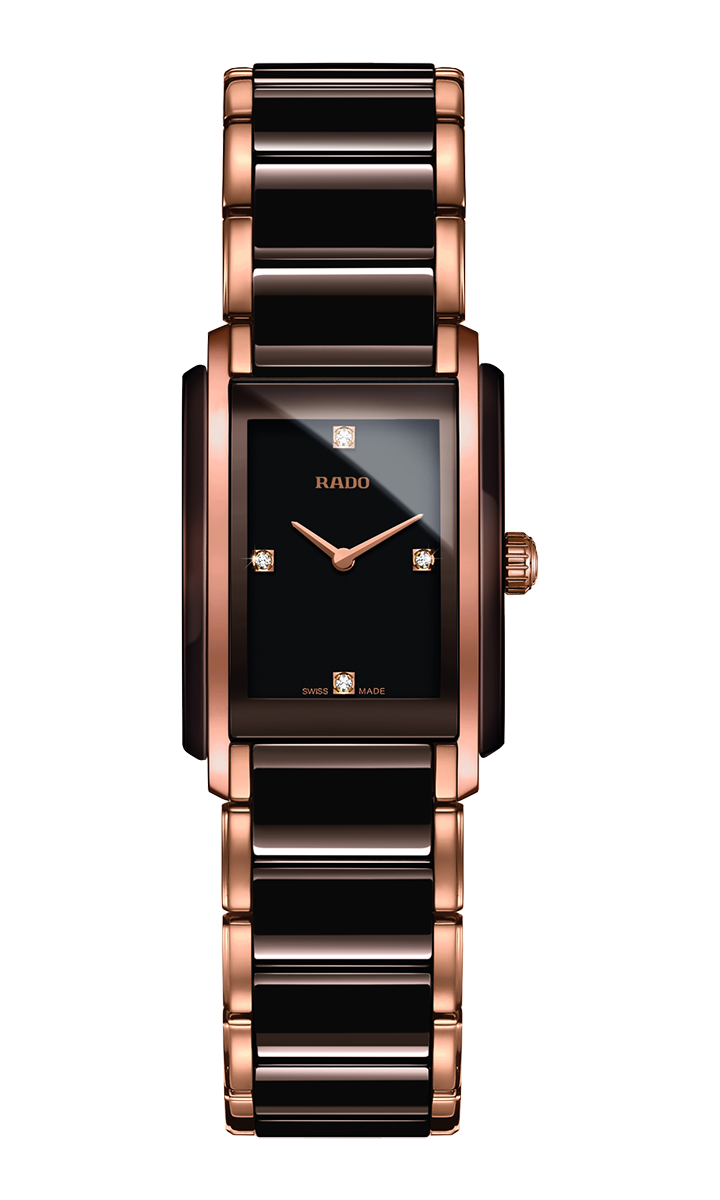 Luxusné hodinky Rado Integral Keramika, Diamanty, Quartz, 22.7 x 33.1 mm. Základné parametre hodín sú: farba ciferníka je čierna, typ strojčeka je Quartz hodinky, materiál remienka je keramika a oceľ a vode odolnosť je 50 m.