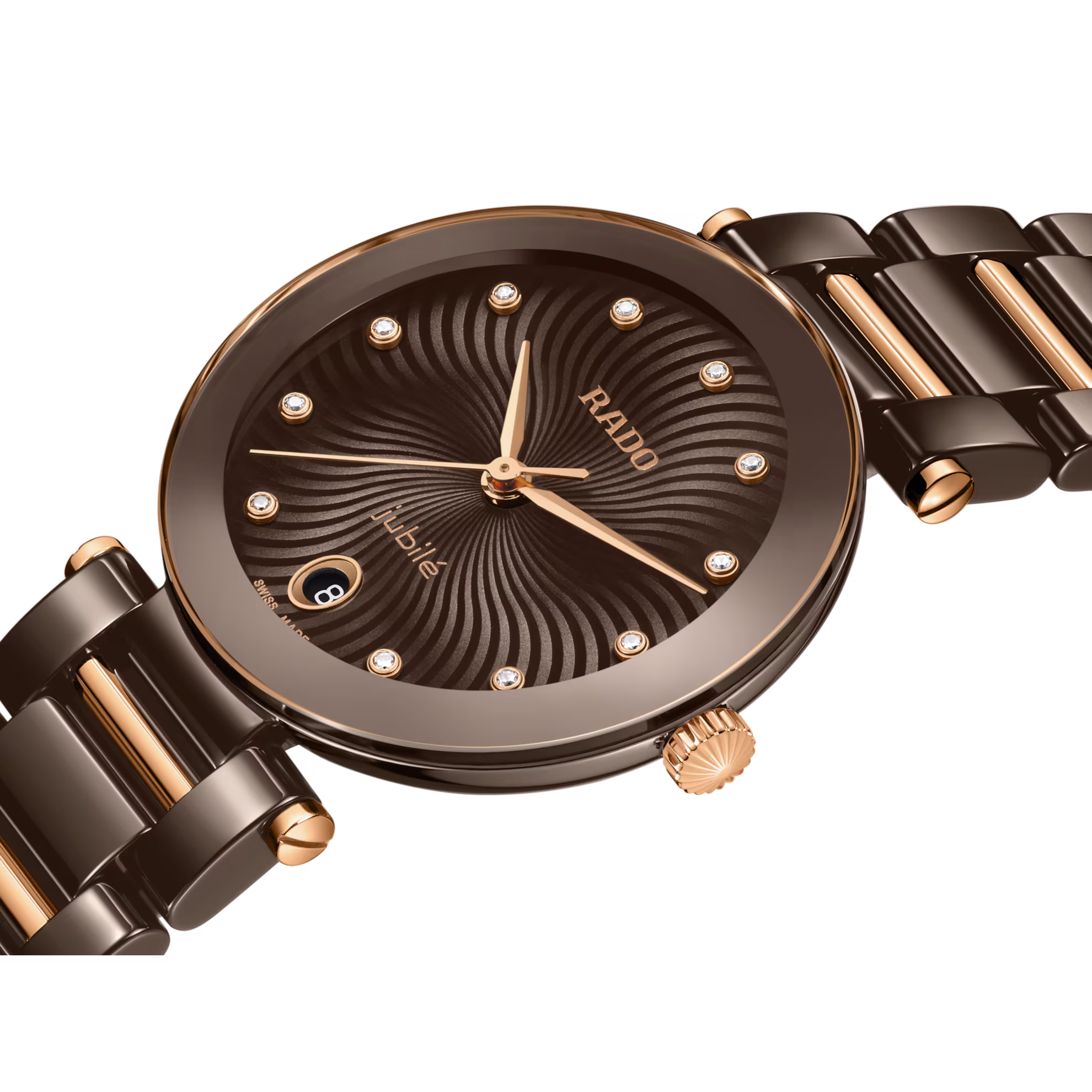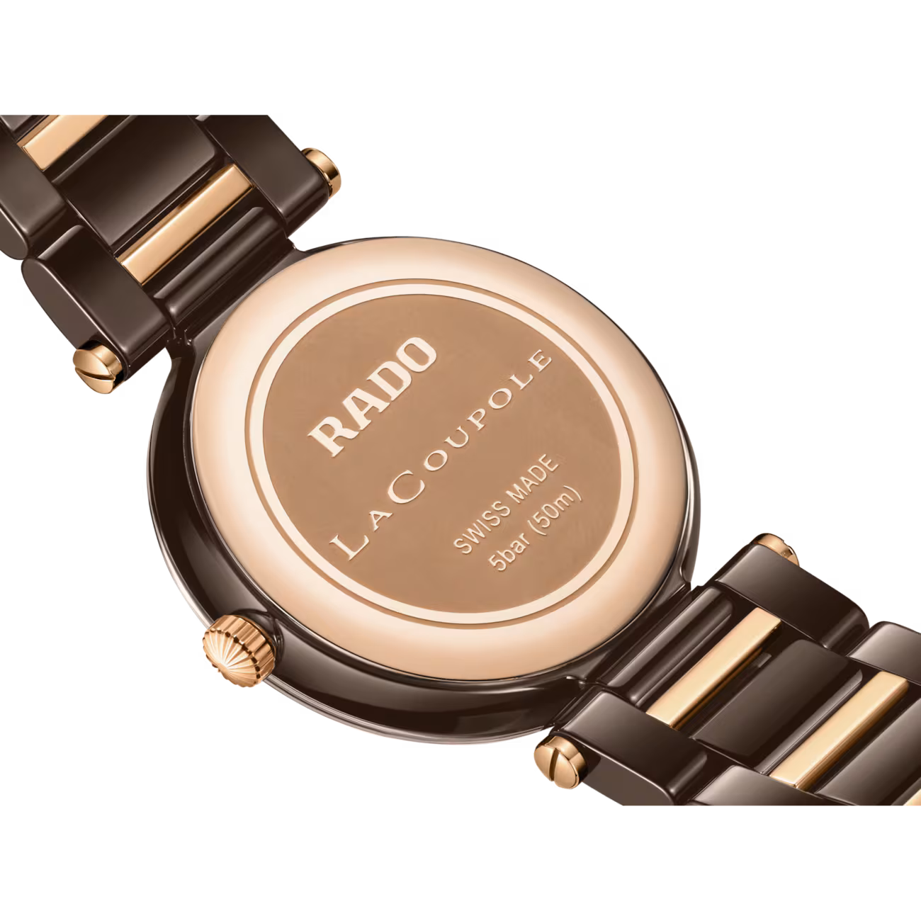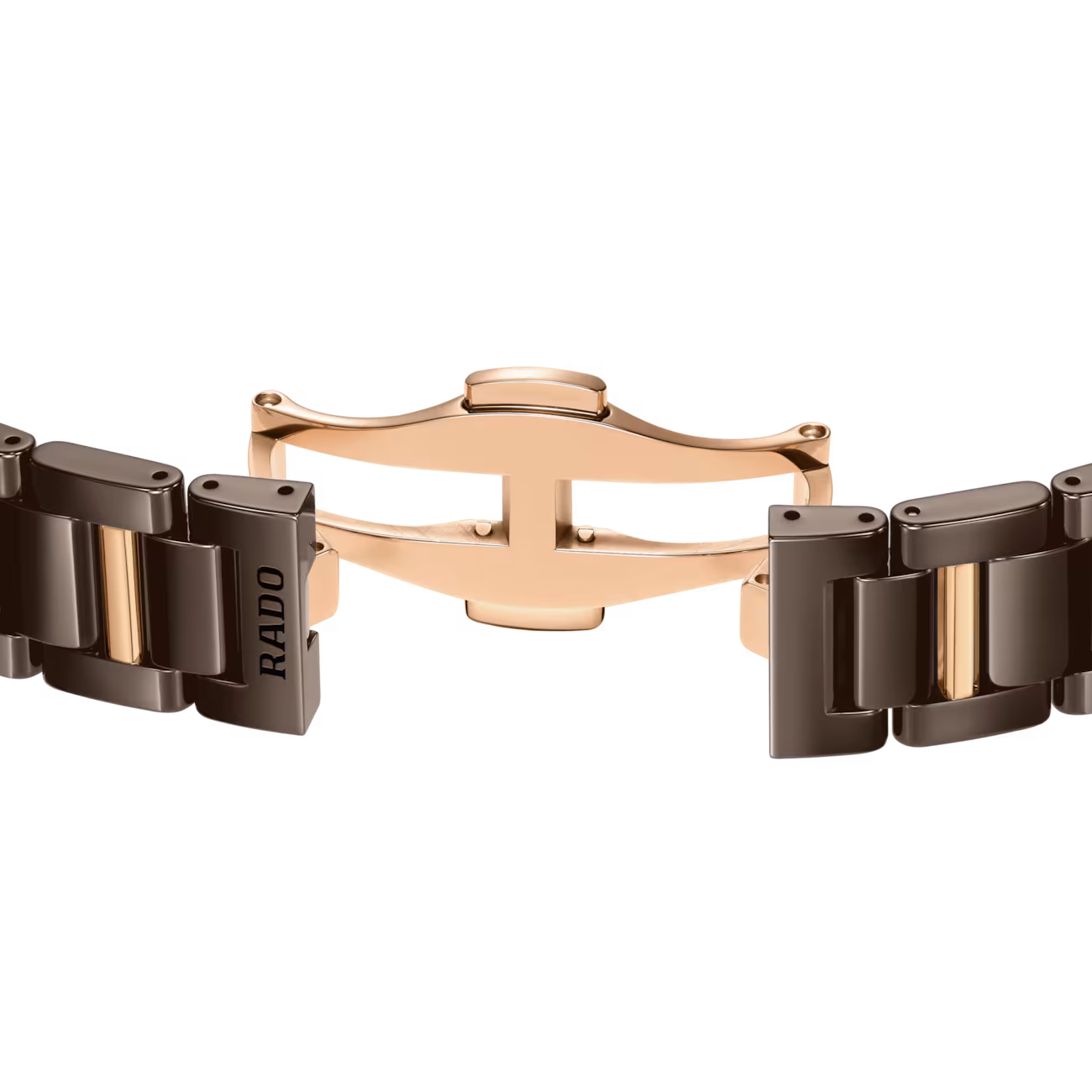 - Náramok: leštená hnedá high‑tech keramika doplnená prvkami s ružovo zlatou PVD úpravou