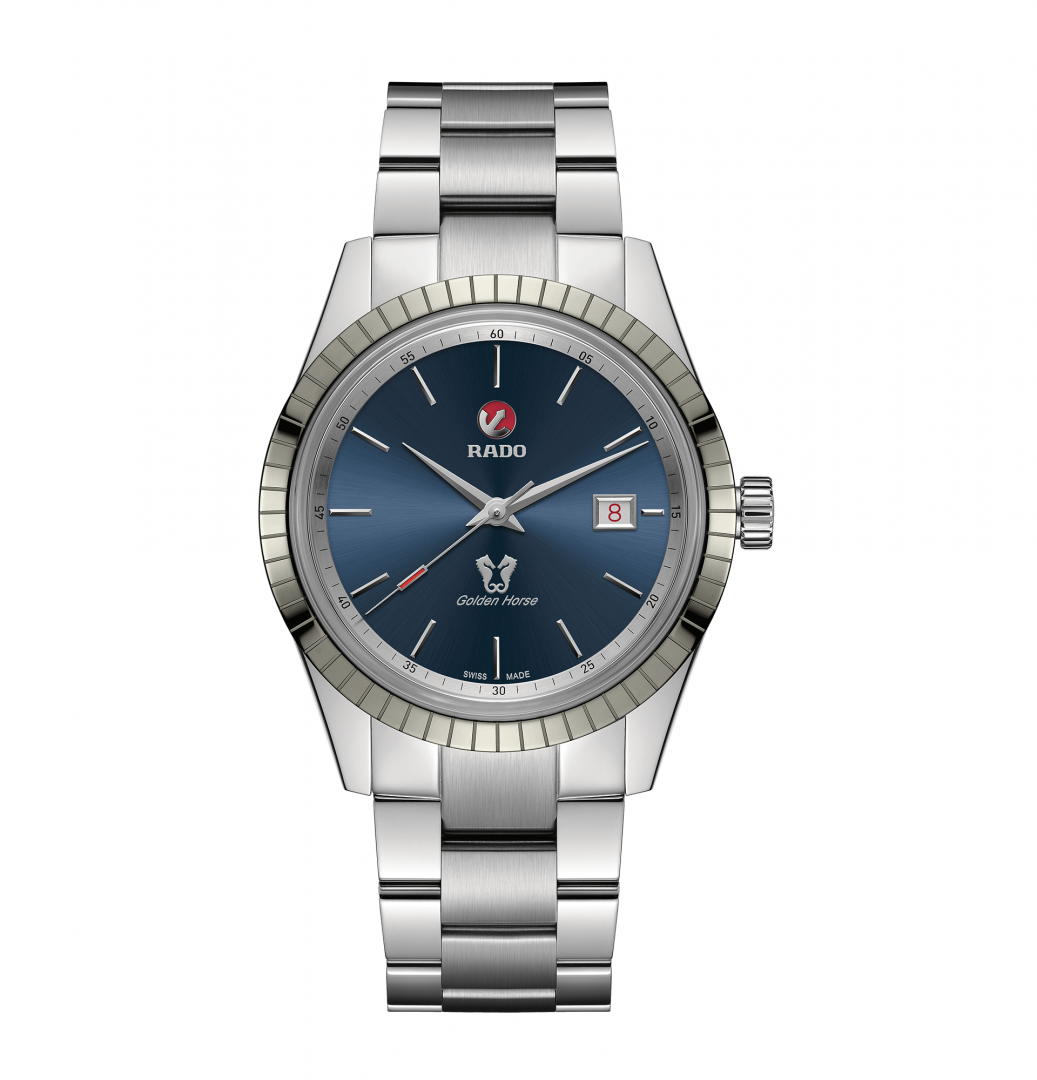 Luxusné hodinky Rado Golden Horse Keramika, Automat, 41.8 mm. Hodinky disponujú funkciami ukazovateľ dátumu. Základné parametre hodín sú: typ strojčeka je mechanické hodinky s automatickým náťahom, materiál remienka je oceľ, vode odolnosť je 50 m a farba ciferníka je modrá.