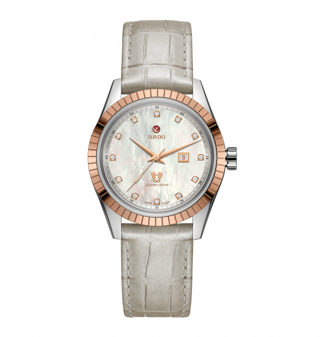Luxusné hodinky Rado Golden Horse Keramika & Diamanty, Automat, 35 mm. Hodinky disponujú funkciami ukazovateľ dátumu. Základné parametre hodín sú: typ strojčeka je mechanické hodinky s automatickým náťahom, vode odolnosť je 50 m, farba ciferníka je perleť a materiál remienka je koža.