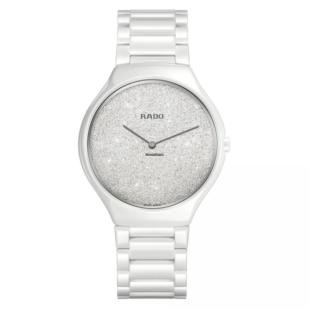 luxusné hodinky Rado True Thinline Quartz, 39 mm. Základné parametre hodín sú: typ strojčeka je Quartz hodinky, materiál remienka je keramika, vode odolnosť je 30 m a farba ciferníka je strieborná.