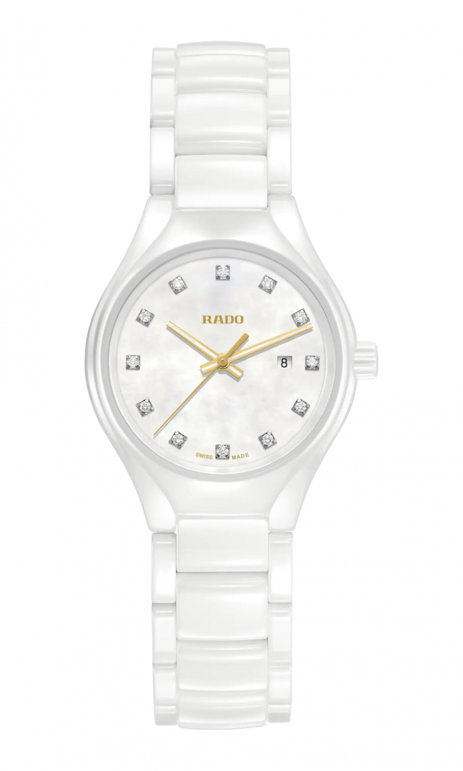 luxusné hodinky Rado True Diamonds Diamanty, Quartz, 30 mm. Hodinky disponujú funkciami luminiscencia, ukazovateľ dátumu a E.O.L.. Základné parametre hodín sú: typ strojčeka je Quartz hodinky, materiál remienka je keramika a titan, vode odolnosť je 50 m a farba ciferníka je biela.