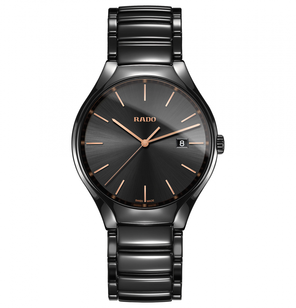 luxusné hodinky Rado True Keramika, Quartz, 40 mm. Hodinky disponujú funkciami ukazovateľ dátumu a E.O.L.. Základné parametre hodín sú: farba ciferníka je čierna, materiál remienka je keramika a titan, vode odolnosť je 50 m a typ strojčeka je Quartz hodinky.