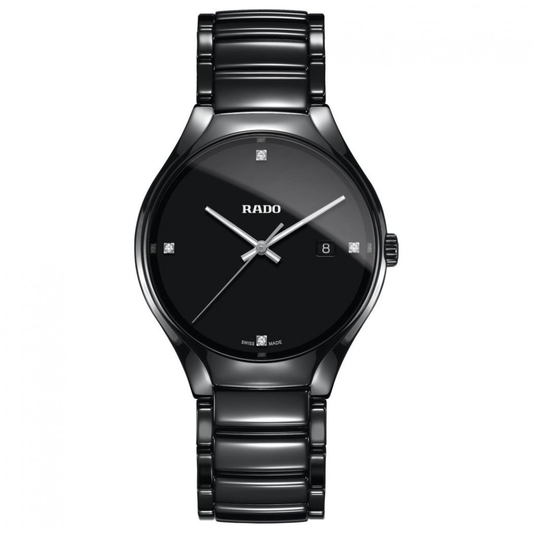 Luxusné hodinky Rado True Diamanty, Keramika, 40 mm. Hodinky disponujú funkciami ukazovateľ dátumu a E.O.L.. Základné parametre hodín sú: farba ciferníka je čierna, typ strojčeka je Quartz hodinky, materiál remienka je keramika a vode odolnosť je 50 m.