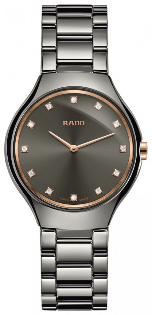 Luxusné hodinky Rado True Diamanty, Quartz, 30 mm. Základné parametre hodín sú: typ strojčeka je Quartz hodinky, vode odolnosť je 30 m, farba ciferníka je šedá a materiál remienka je oceľ.