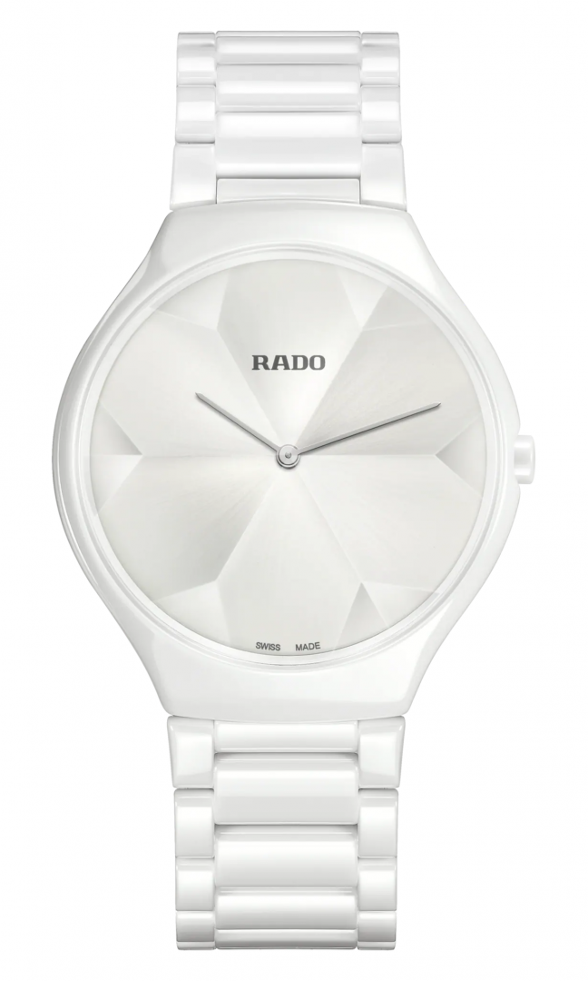 luxusné hodinky Rado True Thinline x Great Gardens of the World Keramika, Quartz, 39 mm. Základné parametre hodín sú: farba ciferníka je biela, typ strojčeka je Quartz hodinky, materiál remienka je keramika a vode odolnosť je 30 m.